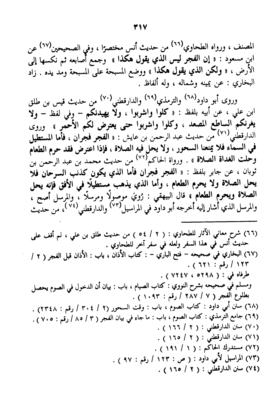 وَرَوَى أَبُو دَاوُد وَالتِّرْمِذِيُّ وَالدَّارَقُطْنِيّ مِنْ حَدِيثِ قَيْسِ بْنِ طَلْقٍ بْنِ عَلِيٍّ، عَنْ أَبِيهِ بِلَفْظِ: «كُلُوا وَاشْرَبُوا، وَلَا يَهِيدَنَّكُمْ - وَفِي لَفْظٍ - وَلَا يَغُرَّنكُمْ السَّاطِعُ الْمُصْعِدُ، وَكُلُوا وَاشْرَبُوا حَتَّى يَعْتَرِضَ لَكُمْ الْأَحْمَرُ» وَرَوَى الدَّارَقُطْنِيُّ مِنْ حَدِيثِ عَبْدِ الرَّحْمَنِ بْنِ عَائِشٍ: «الْفَجْرُ فَجْرَانِ، فَأَمَّا الْمُسْتَطِيلُ فِي السَّمَاءِ فَلَا يَمْنَعُنَا السُّحُورَ، وَلَا يَحِلُّ فِيهِ الصَّلَاةُ، فَإِذَا اعْتَرَضَ فَقَدْ حَرُمَ الطَّعَامُ وَحَلَّتْ الْغَدَاةَ الصَّلَاةُ» . وَرَوَاهُ الْحَاكِمُ مِنْ حَدِيثِ مُحَمَّدِ بْنِ عَبْدِ الرَّحْمَنِ بْنِ ثَوْبَانَ، عَنْ جَابِرٍ بِلَفْظِ: «الْفَجْرُ فَجْرَانِ فَأَمَّا الَّذِي يَكُونُ كَذَنَبِ السِّرْحَانِ فَلَا يُحِلُّ الصَّلَاةَ وَلَا يُحَرِّمُ الطَّعَامَ، وَأَمَّا الَّذِي يَذْهَبُ مُسْتَطِيلًا فِي الْأُفُقِ فَإِنَّهُ يُحِلُّ الصَّلَاةَ وَيُحَرِّمُ الطَّعَامَ» قَالَ الْبَيْهَقِيُّ: رُوِيَ مَوْصُولًا وَمُرْسَلًا، وَالْمُرْسَلُ أَصَحُّ، وَالْمُرْسَلُ الَّذِي أَشَارَ إلَيْهِ أَخْرَجَهُ أَبُو دَاوُد فِي الْمَرَاسِيلِ وَالدَّارَقُطْنِيّ، مِنْ حَدِيثِ