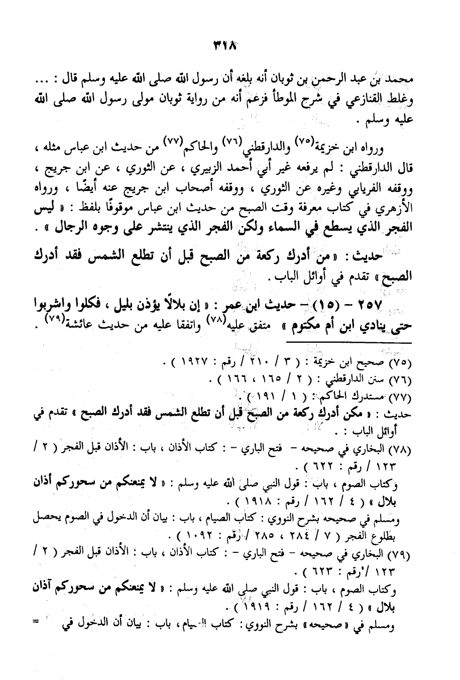 مُحَمَّدِ بْنِ عَبْدِ الرَّحْمَنِ بْنِ ثَوْبَانَ أَنَّهُ بَلَغَهُ أَنَّ رَسُولَ اللَّهِ - صَلَّى اللَّهُ عَلَيْهِ وَسَلَّمَ - قَالَ: وَغَلِطَ الْقَنَازِعِيُّ فِي شَرْحِ الْمُوَطَّأِ فَزَعَمَ أَنَّهُ مِنْ رِوَايَةِ ثَوْبَانَ مَوْلَى رَسُولِ اللَّهِ - صَلَّى اللَّهُ عَلَيْهِ وَسَلَّمَ -. وَرَوَاهُ ابْنُ خُزَيْمَةَ وَالدَّارَقُطْنِيّ وَالْحَاكِمُ مِنْ حَدِيثِ ابْنِ عَبَّاسٍ مِثْلَهُ، قَالَ الدَّارَقُطْنِيُّ: لَمْ يَرْفَعْهُ غَيْرُ أَبِي أَحْمَدُ الزُّبَيْرِيُّ، عَنْ الثَّوْرِيِّ، عَنْ ابْنِ جُرَيْجٍ، وَوَقَفَهُ الْفِرْيَابِيُّ وَغَيْرُهُ عَنْ الثَّوْرِيِّ، وَوَقَفَهُ أَصْحَابُ ابْنِ جُرَيْجٍ عَنْهُ أَيْضًا، وَرَوَاهُ الْأَزْهَرِيُّ فِي كِتَابِ مَعْرِفَةِ وَقْتِ الصُّبْحِ مِنْ حَدِيثِ ابْنِ عَبَّاسٍ مَوْقُوفًا بِلَفْظِ: لَيْسَ الْفَجْرُ الَّذِي يَسْطَعُ فِي السَّمَاءِ وَلَكِنْ الْفَجْرُ الَّذِي يَنْتَشِرُ عَلَى وُجُوهِ الرِّجَالِ ".