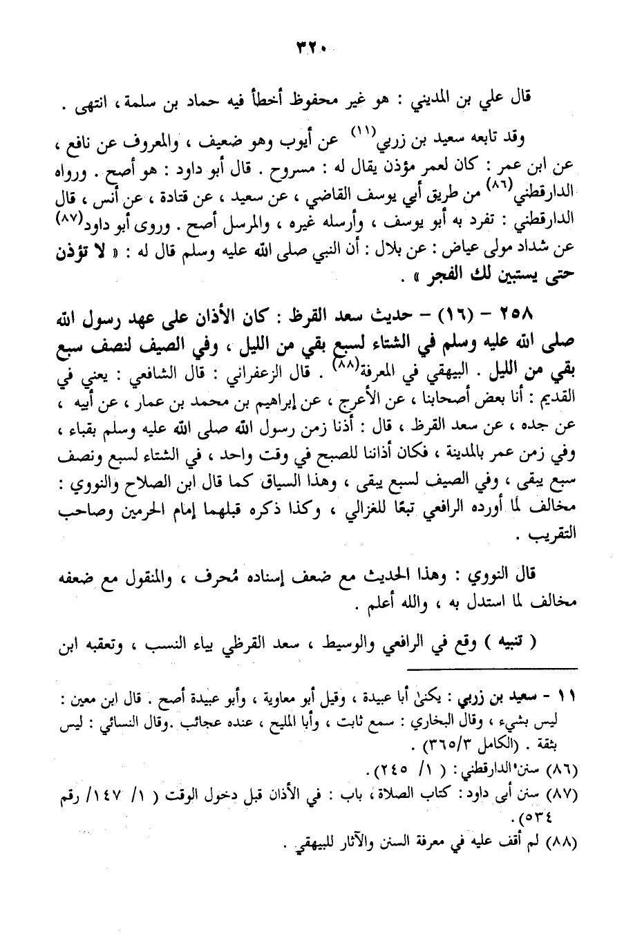 258 - (16) - حَدِيثُ سَعْدِ الْقَرَظِ: «كَانَ الْأَذَانُ عَلَى عَهْدِ رَسُولِ اللَّهِ - صَلَّى اللَّهُ عَلَيْهِ وَسَلَّمَ - فِي الشِّتَاءِ لِسُبْعٍ بَقِيَ مِنْ اللَّيْلِ، وَفِي الصَّيْفِ لِنِصْفِ سُبْعٍ بَقِيَ مِنْ اللَّيْلِ» . الْبَيْهَقِيّ فِي الْمَعْرِفَةِ. قَالَ الزَّعْفَرَانِيُّ: قَالَ الشَّافِعِيُّ: يَعْنِي فِي الْقَدِيمِ: أَنَا بَعْضُ أَصْحَابِنَا، عَنْ الْأَعْرَجِ، عَنْ إبْرَاهِيمَ بْنِ مُحَمَّدِ بْنِ عَمَّارٍ، عَنْ أَبِيهِ، عَنْ جَدِّهِ، عَنْ سَعْدِ الْقَرَظِ، قَالَ: «أَذَّنَّا زَمَنَ رَسُولِ اللَّهِ - صَلَّى اللَّهُ عَلَيْهِ وَسَلَّمَ - بِقُبَاءَ، وَفِي زَمَنِ عُمَرَ بِالْمَدِينَةِ، فَكَانَ أَذَانُنَا لِلصُّبْحِ فِي وَقْتٍ وَاحِدٍ، فِي الشِّتَاءِ لِسُبْعٍ وَنِصْفِ سُبْعٍ يَبْقَى، وَفِي الصَّيْفِ لِسُبْعٍ يَبْقَى» ، وَهَذَا السِّيَاقُ كَمَا قَالَ ابْنُ الصَّلَاحِ وَالنَّوَوِيُّ: مُخَالِفٌ لِمَا أَوْرَدَهُ الرَّافِعِيُّ تَبَعًا لِلْغَزَالِيِّ، وَكَذَا ذَكَرَهُ قَبْلَهُمَا إمَامُ الْحَرَمَيْنِ وَصَاحِبُ التَّقْرِيبِ. قَالَ النَّوَوِيُّ: وَهَذَا الْحَدِيثُ مَعَ ضَعْفِ إسْنَادِهِ مُحَرَّفٌ، وَالْمَنْقُولُ مَعَ ضَعْفِهِ مُخَالِفٌ لِمَا اُسْتُدِلَّ بِهِ، وَاَللَّهُ أَعْلَمُ.