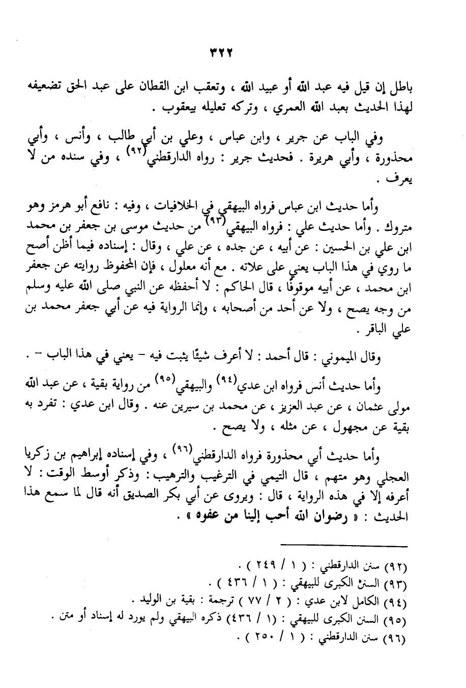 وَفِي الْبَابِ عَنْ جَرِيرٍ، وَابْنِ عَبَّاسٍ، وَعَلِيِّ بْنِ أَبِي طَالِبٍ، وَأَنَسٍ، وَأَبِي مَحْذُورَةَ، وَأَبِي هُرَيْرَةَ. فَحَدِيثُ جَرِيرٍ: رَوَاهُ الدَّارَقُطْنِيُّ، وَفِي سَنَدِهِ مَنْ لَا يُعْرَفُ. وَأَمَّا حَدِيثُ ابْنِ عَبَّاسٍ فَرَوَاهُ الْبَيْهَقِيُّ فِي الْخِلَافِيَّاتِ، وَفِيهِ: نَافِعٌ أَبُو هُرْمُزَ وَهُوَ مَتْرُوكٌ. وَأَمَّا حَدِيثُ عَلِيٍّ: فَرَوَاهُ الْبَيْهَقِيُّ مِنْ حَدِيثِ مُوسَى بْنِ جَعْفَرِ بْنِ مُحَمَّدٍ بْنِ عَلِيِّ بْنِ الْحُسَيْنِ: عَنْ أَبِيهِ، عَنْ جَدِّهِ، عَنْ عَلِيٍّ، وَقَالَ: إسْنَادُهُ فِيمَا أَظُنُّ أَصَحُّ مَا رُوِيَ فِي هَذَا الْبَابِ يَعْنِي عَلَى عِلَّاتِهِ. مَعَ أَنَّهُ مَعْلُولٌ، فَإِنَّ الْمَحْفُوظَ رِوَايَتُهُ عَنْ جَعْفَرِ بْنِ مُحَمَّدٍ، عَنْ أَبِيهِ مَوْقُوفًا، قَالَ الْحَاكِمُ: لَا أَحْفَظُهُ عَنْ النَّبِيِّ - صَلَّى اللَّهُ عَلَيْهِ وَسَلَّمَ - مِنْ وَجْهٍ يَصِحُّ، وَلَا عَنْ أَحَدٍ مِنْ أَصْحَابِهِ، وَإِنَّمَا الرِّوَايَةُ فِيهِ عَنْ أَبِي جَعْفَرٍ مُحَمَّدِ بْنِ عَلِيٍّ الْبَاقِرِ. وَقَالَ الْمَيْمُونِيُّ: قَالَ أَحْمَدُ: لَا أَعْرِفُ شَيْئًا يَثْبُتُ فِيهِ - يَعْنِي فِي هَذَا الْبَابِ -. وَأَمَّا حَدِيثُ أَنَسٍ فَرَوَاهُ ابْنُ عَدِيٍّ وَالْبَيْهَقِيُّ مِنْ رِوَايَةِ بَقِيَّةَ، عَنْ عَبْدِ اللَّهِ مَوْلَى عُثْمَانَ، عَنْ عَبْدِ الْعَزِيزِ، عَنْ مُحَمَّدِ بْنِ سِيرِينَ عَنْهُ. وَقَالَ ابْنُ عَدِيٍّ: تَفَرَّدَ بِهِ بَقِيَّةُ عَنْ مَجْهُولٍ، عَنْ مِثْلِهِ، وَلَا يَصِحُّ. وَأَمَّا حَدِيثُ أَبِي مَحْذُورَةَ فَرَوَاهُ الدَّارَقُطْنِيُّ، وَفِي إسْنَادِهِ إبْرَاهِيمُ بْنُ زَكَرِيَّا الْعِجْلِيِّ وَهُوَ مُتَّهَمٌ، قَالَ التَّيْمِيُّ فِي التَّرْغِيبِ وَالتَّرْهِيبِ: وَذَكَرَ أَوْسَطَ الْوَقْتِ: لَا أَعْرِفُهُ إلَّا فِي هَذِهِ الرِّوَايَةِ، قَالَ: وَيُرْوَى عَنْ أَبِي بَكْرٍ الصِّدِّيقِ أَنَّهُ قَالَ لَمَّا سَمِعَ هَذَا الْحَدِيثَ: رِضْوَانُ اللَّهِ أَحَبُّ إلَيْنَا مِنْ عَفْوِهِ ".