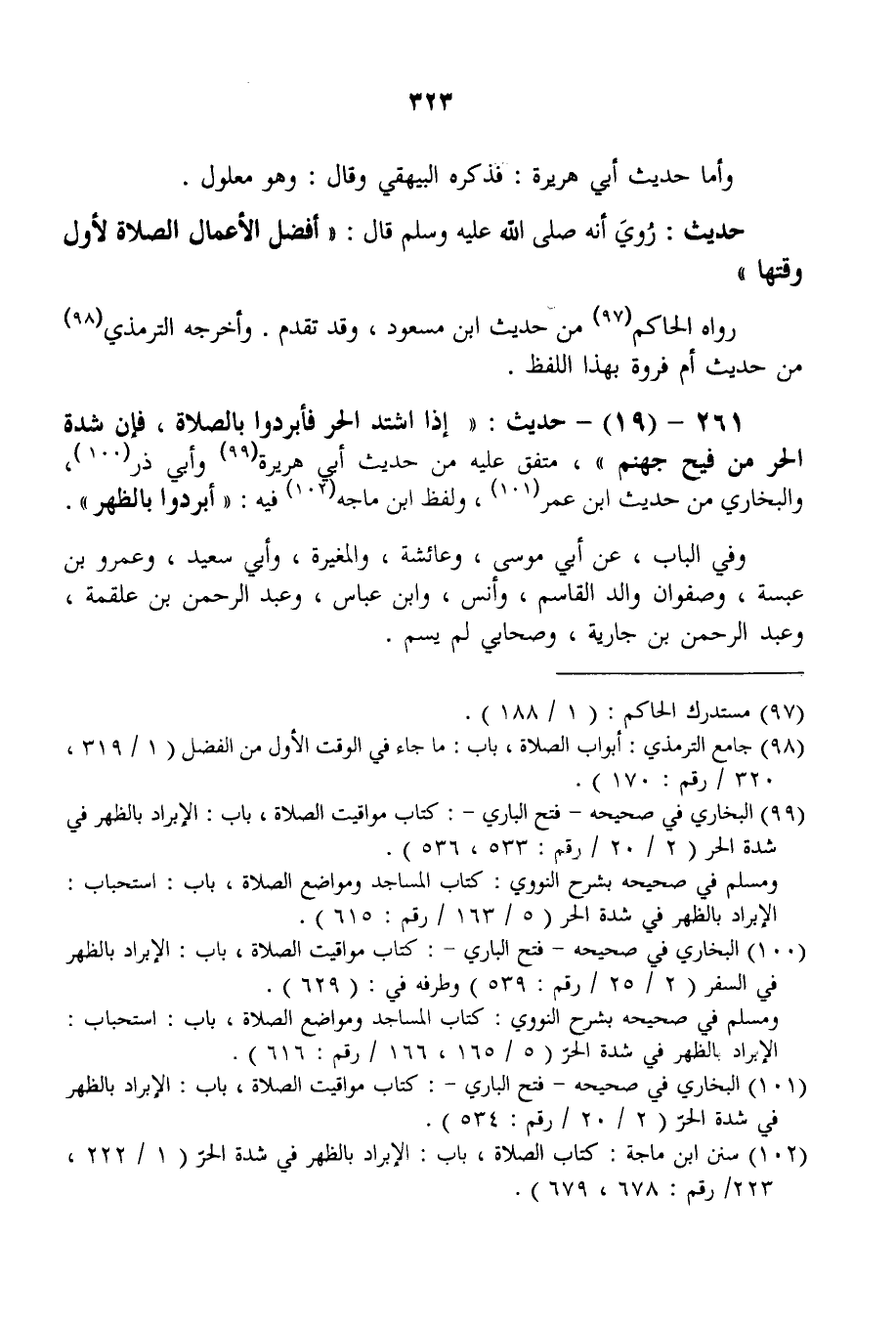 261 - (19) - حَدِيثٌ: «إذَا اشْتَدَّ الْحَرُّ فَأَبْرِدُوا بِالصَّلَاةِ، فَإِنَّ شِدَّةَ الْحَرِّ مِنْ فَيْحِ جَهَنَّمَ» ، مُتَّفَقٌ عَلَيْهِ مِنْ حَدِيثِ أَبِي هُرَيْرَةَ وَأَبِي ذَرٍّ، وَالْبُخَارِيِّ مِنْ حَدِيثِ ابْنِ عُمَرَ، وَلَفْظُ ابْنِ مَاجَهْ فِيهِ: «أَبْرِدُوا بِالظُّهْرِ» .