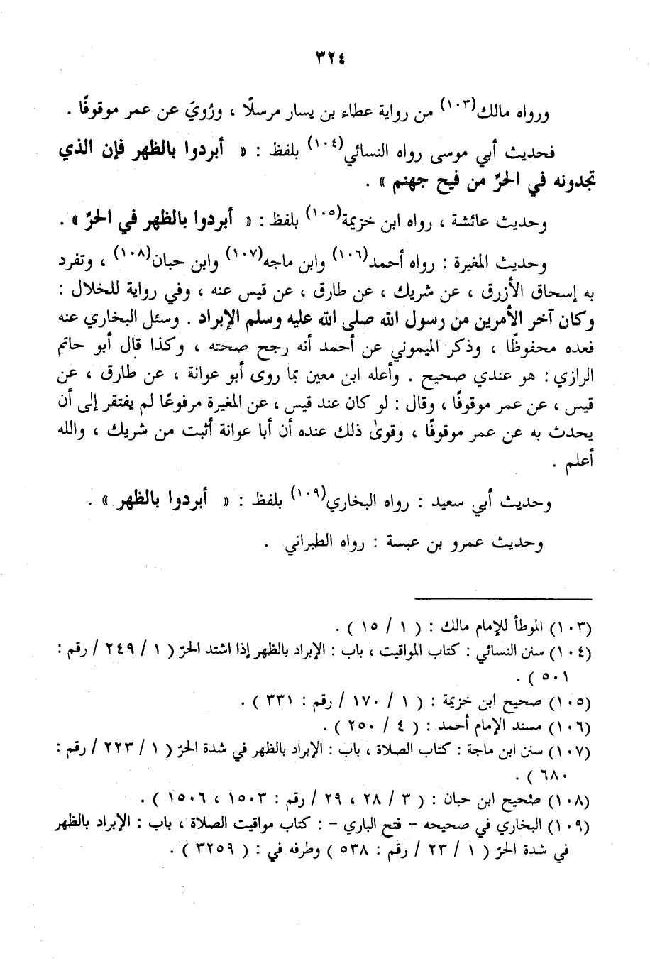 وَرَوَاهُ مَالِكٌ مِنْ رِوَايَةِ عَطَاءِ بْنِ يَسَارٍ مُرْسَلًا، وَرُوِيَ عَنْ عُمَرَ مَوْقُوفًا. فَحَدِيثُ أَبِي مُوسَى رَوَاهُ النَّسَائِيُّ بِلَفْظِ: «أَبْرِدُوا بِالظُّهْرِ فَإِنَّ الَّذِي تَجِدُونَهُ فِي الْحَرِّ مِنْ فَيْحِ جَهَنَّمَ» . وَحَدِيثُ عَائِشَةَ، رَوَاهُ ابْنُ خُزَيْمَةَ بِلَفْظِ: «أَبْرِدُوا بِالظُّهْرِ فِي الْحَرِّ» . وَحَدِيثُ الْمُغِيرَةِ رَوَاهُ أَحْمَدُ وَابْنُ مَاجَهْ وَابْنُ حِبَّانَ، وَتَفَرَّدَ بِهِ إِسْحَاقُ الْأَزْرَقُ، عَنْ شَرِيكٍ، عَنْ طَارِقٍ، عَنْ قَيْسٍ عَنْهُ، وَفِي رِوَايَةٍ لِلْخَلَّالِ: «وَكَانَ آخِرُ الْأَمْرَيْنِ مِنْ رَسُولِ اللَّهِ - صَلَّى اللَّهُ عَلَيْهِ وَسَلَّمَ - الْإِبْرَادَ» . وَسُئِلَ الْبُخَارِيُّ عَنْهُ فَعَدَّهُ مَحْفُوظًا، وَذَكَرَ الْمَيْمُونِيُّ عَنْ أَحْمَدَ أَنَّهُ رَجَّحَ صِحَّتَهُ، وَكَذَا قَالَ أَبُو حَاتِمٍ الرَّازِيّ: هُوَ عِنْدِي صَحِيحٌ. وَأَعَلَّهُ ابْنُ مَعِينٍ بِمَا رَوَى أَبُو عَوَانَةَ، عَنْ طَارِقٍ، عَنْ قَيْسٍ، عَنْ عُمَرَ مَوْقُوفًا، وَقَالَ: لَوْ كَانَ عِنْدَ قَيْسٍ، عَنْ الْمُغِيرَةِ مَرْفُوعًا لَمْ يَفْتَقِرْ إلَى أَنْ يُحَدِّثَ بِهِ عَنْ عُمَرَ مَوْقُوفًا، وَقَوَّى ذَلِكَ عِنْدَهُ أَنَّ أَبَا عَوَانَةَ أَثْبَتُ مِنْ شَرِيكٍ، وَاَللَّهُ أَعْلَمُ. وَحَدِيثُ أَبِي سَعِيدٍ: رَوَاهُ الْبُخَارِيُّ بِلَفْظِ: «أَبْرِدُوا بِالظُّهْرِ» . وَحَدِيثُ عَمْرِو بْنِ عَبَسَةَ: رَوَاهُ الطَّبَرَانِيُّ.