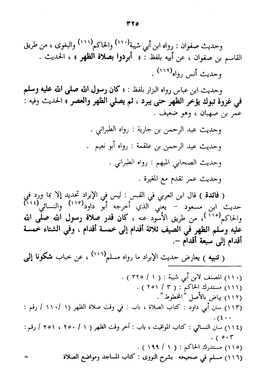 وَحَدِيثُ صَفْوَانَ: رَوَاهُ ابْنُ أَبِي شَيْبَةَ وَالْحَاكِمُ وَالْبَغَوِيُّ، مِنْ طَرِيقِ الْقَاسِمِ بْنِ صَفْوَانَ، عَنْ أَبِيهِ بِلَفْظِ: «أَبْرِدُوا بِصَلَاةِ الظُّهْرِ» ، الْحَدِيثَ. وَحَدِيثُ أَنَسٍ رَوَاهُ. وَحَدِيثُ ابْنِ عَبَّاسٍ رَوَاهُ الْبَزَّارُ بِلَفْظِ: «كَانَ رَسُولُ اللَّهِ - صَلَّى اللَّهُ عَلَيْهِ وَسَلَّمَ - فِي غَزْوَةِ تَبُوكَ يُؤَخِّرُ الظُّهْرَ حَتَّى يُبْرِدَ، ثُمَّ يُصَلِّيَ الظُّهْرَ وَالْعَصْرَ» الْحَدِيثَ وَفِيهِ: عُمَرُ بْنُ صَهْبَانَ، وَهُوَ ضَعِيفٌ. وَحَدِيثُ عَبْدِ الرَّحْمَنِ بْنِ جَارِيَةَ: رَوَاهُ الطَّبَرَانِيُّ. وَحَدِيثُ عَبْدِ الرَّحْمَنِ بْنِ عَلْقَمَةَ: رَوَاهُ أَبُو نُعَيْمٍ. وَحَدِيثُ الصَّحَابِيِّ الْمُبْهَمِ: رَوَاهُ الطَّبَرَانِيُّ. وَحَدِيثُ عُمَرَ تَقَدَّمَ مَعَ الْمُغِيرَةِ.
