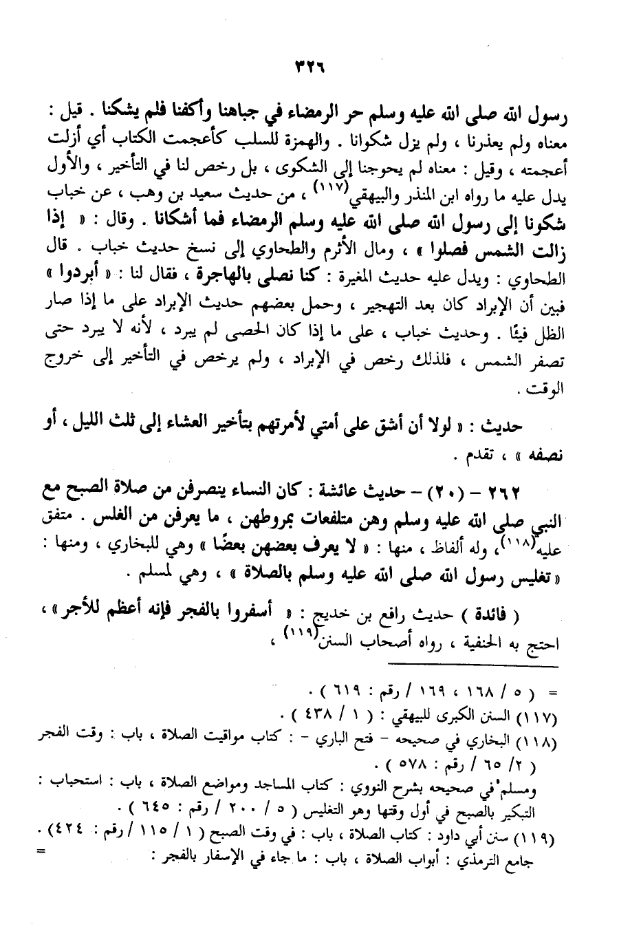 حَدِيثٌ رَافِعِ بْنِ خَدِيجٍ: «أَسْفِرُوا بِالْفَجْرِ فَإِنَّهُ أَعْظَمُ لِلْأَجْرِ» ، احْتَجَّ بِهِ الْحَنَفِيَّةُ، رَوَاهُ أَصْحَابُ السُّنَنِ،