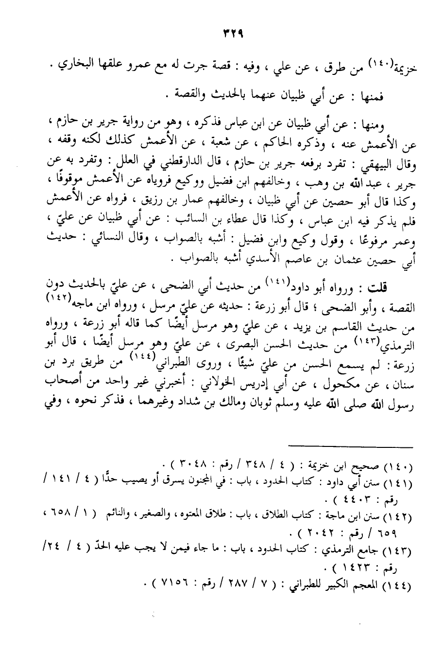 وَابْنُ خُزَيْمَةَ مِنْ طُرُقٍ، عَنْ عَلِيٍّ، وَفِيهِ: قِصَّةٌ جَرَتْ لَهُ مَعَ عَمْرٍو عَلَّقَهَا الْبُخَارِيُّ. فَمِنْهَا: عَنْ أَبِي ظَبْيَانَ عَنْهُمَا بِالْحَدِيثِ وَالْقِصَّةِ. وَمِنْهَا: عَنْ أَبِي ظَبْيَانَ عَنْ ابْنِ عَبَّاسٍ فَذَكَرَهُ، وَهُوَ مِنْ رِوَايَةِ جَرِيرِ بْنِ حَازِمٍ، عَنْ الْأَعْمَشِ عَنْهُ، وَذَكَرَهُ الْحَاكِمُ، عَنْ شُعْبَةَ، عَنْ الْأَعْمَشِ كَذَلِكَ لَكِنَّهُ وَقَفَهُ، وَقَالَ الْبَيْهَقِيُّ: تَفَرَّدَ بِرَفْعِهِ جَرِيرُ بْنُ حَازِمٍ، قَالَ الدَّارَقُطْنِيُّ فِي الْعِلَلِ: وَتَفَرَّدَ بِهِ عَنْ جَرِيرٍ، عَبْدُ اللَّهِ بْنُ وَهْبٍ، وَخَالَفَهُمْ ابْنُ فُضَيْلٍ وَوَكِيعٌ فَرَوَيَاهُ عَنْ الْأَعْمَشِ مَوْقُوفًا، وَكَذَا قَالَ أَبُو حُصَيْنٍ عَنْ أَبِي ظَبْيَانَ، وَخَالَفَهُمْ عَمَّارُ بْنُ رُزَيْقٍ، فَرَوَاهُ عَنْ الْأَعْمَشِ فَلَمْ يَذْكُرْ فِيهِ ابْنَ عَبَّاسٍ، وَكَذَا قَالَ عَطَاءُ بْنُ السَّائِبِ: عَنْ أَبِي ظَبْيَانَ عَنْ عَلِيٍّ، وَعُمَرَ مَرْفُوعًا، وَقَوْلُ وَكِيعٍ وَابْنِ فُضَيْلٍ أَشْبَهُ بِالصَّوَابِ، وَقَالَ النَّسَائِيُّ: حَدِيثُ أَبِي حُصَيْنٍ عُثْمَانَ بْنِ عَاصِمٍ الْأَسَدِيِّ أَشْبَهُ بِالصَّوَابِ.