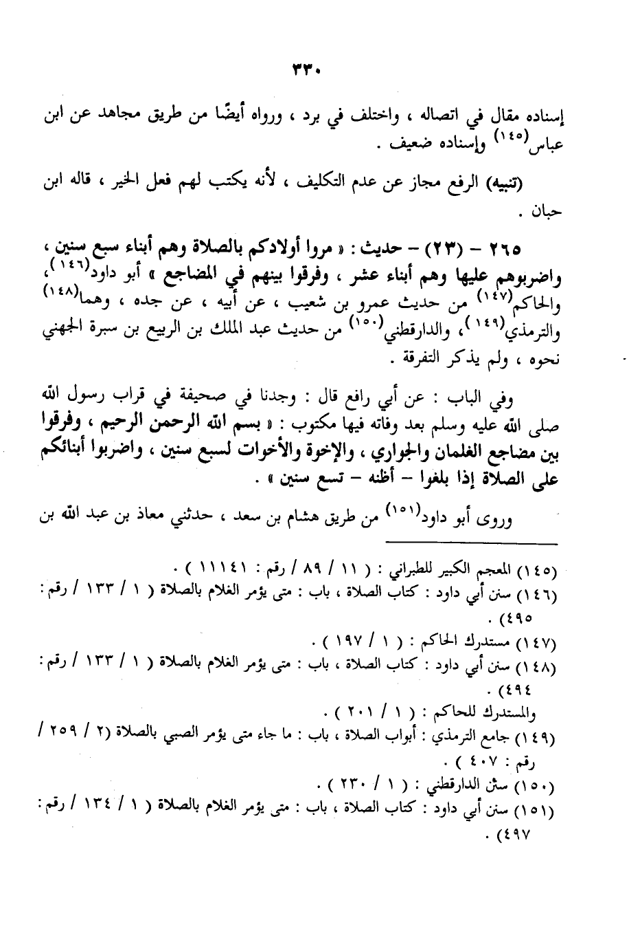 265 - (23) - حَدِيثُ: «مُرُوا أَوْلَادَكُمْ بِالصَّلَاةِ وَهُمْ أَبْنَاءُ سَبْعِ سِنِينَ، وَاضْرِبُوهُمْ عَلَيْهَا وَهُمْ أَبْنَاءُ عَشْرٍ، وَفَرِّقُوا بَيْنَهُمْ فِي الْمَضَاجِعِ» أَبُو دَاوُد، وَالْحَاكِمُ مِنْ حَدِيثِ عَمْرِو بْنِ شُعَيْبٍ، عَنْ أَبِيهِ، عَنْ جَدِّهِ، وَهُمَا وَالتِّرْمِذِيُّ، وَالدَّارَقُطْنِيّ مِنْ حَدِيثِ عَبْدِ الْمَلِكِ بْنِ الرَّبِيعِ بْنِ سَبْرَةَ الْجُهَنِيِّ نَحْوَهُ، وَلَمْ يَذْكُرْ التَّفْرِقَةَ.
