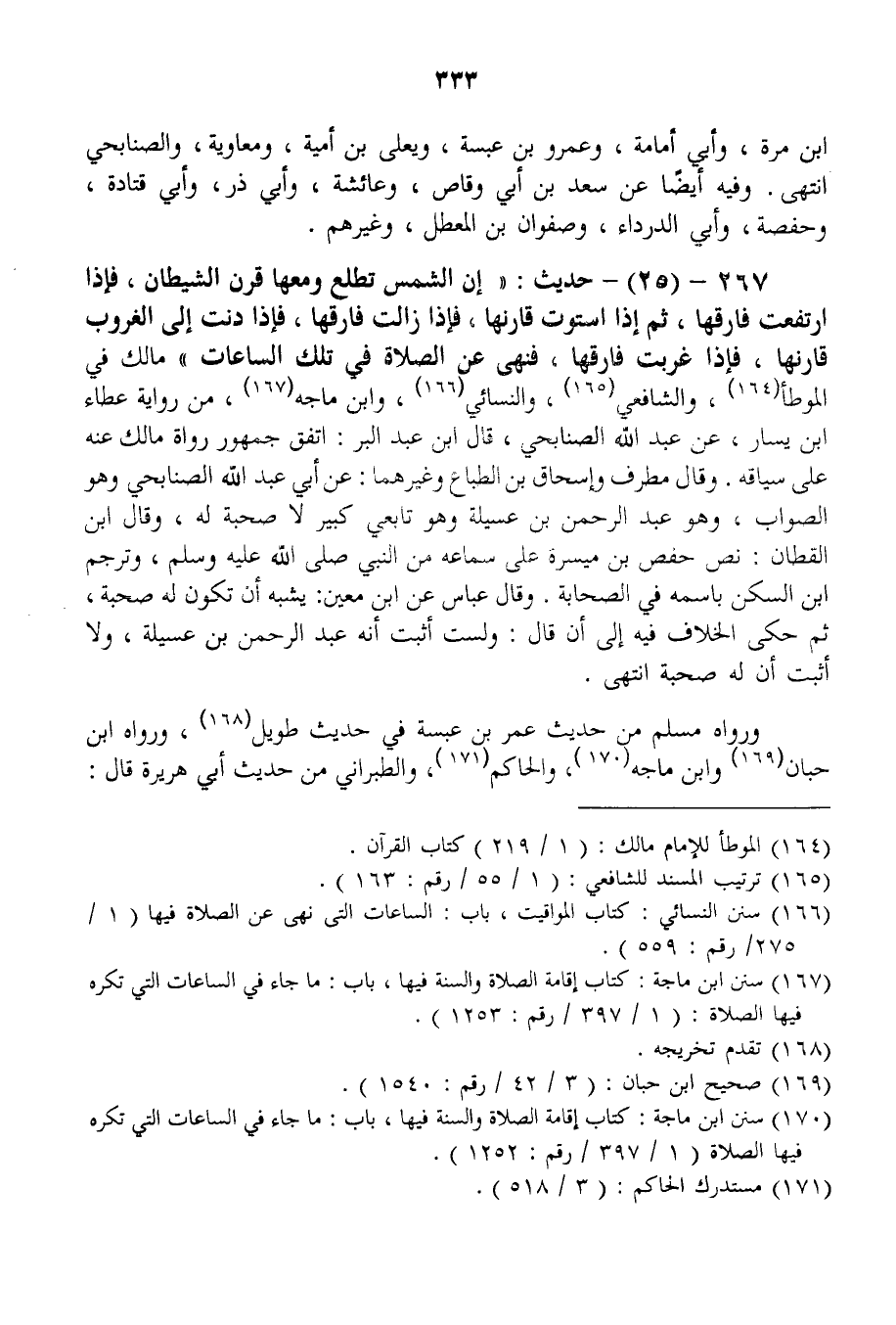 267 - (25) - حَدِيثُ: «إنَّ الشَّمْسَ تَطْلُعُ وَمَعَهَا قَرْنُ الشَّيْطَانِ، فَإِذَا ارْتَفَعَتْ فَارَقَهَا، ثُمَّ إذَا اسْتَوَتْ قَارَنَهَا، فَإِذَا زَالَتْ فَارَقَهَا، فَإِذَا دَنَتْ إلَى الْغُرُوبِ قَارَنَهَا، فَإِذَا غَرَبَتْ فَارَقَهَا، فَنَهَى عَنْ الصَّلَاةِ فِي تِلْكَ السَّاعَاتِ» مَالِكٌ فِي الْمُوَطَّأِ، وَالشَّافِعِيُّ، وَالنَّسَائِيُّ، وَابْنُ مَاجَهْ، مِنْ رِوَايَةِ عَطَاءِ بْنِ يَسَارٍ، عَنْ عَبْدِ اللَّهِ الصُّنَابِحِيِّ، قَالَ ابْنُ عَبْدِ الْبَرِّ: اتَّفَقَ جُمْهُورُ رُوَاةِ مَالِكٍ عَنْهُ عَلَى سِيَاقِهِ. وَقَالَ مُطَرِّفٌ وَإِسْحَاقُ بْنِ الطَّبَّاعِ وَغَيْرُهُمَا: عَنْ أَبِي عَبْدِ اللَّهِ الصُّنَابِحِيِّ وَهُوَ الصَّوَابُ، وَهُوَ عَبْدُ الرَّحْمَنِ بْنُ عُسَيْلَةَ وَهُوَ تَابِعِيٌّ كَبِيرٌ لَا صُحْبَةَ لَهُ، وَقَالَ ابْنُ الْقَطَّانِ: نَصَّ حَفْصُ بْنُ مَيْسَرَةَ عَلَى سَمَاعِهِ مِنْ النَّبِيِّ - صَلَّى اللَّهُ عَلَيْهِ وَسَلَّمَ -، وَتَرْجَمَ ابْنُ السَّكَنِ بِاسْمِهِ فِي الصَّحَابَةِ. وَقَالَ عَبَّاسٌ عَنْ ابْنِ مَعِينٍ: يُشْبِهُ أَنْ تَكُونَ لَهُ صُحْبَةٌ، ثُمَّ حَكَى الْخِلَافَ فِيهِ إلَى أَنْ قَالَ: وَلَسْت أُثْبِتُ أَنَّهُ عَبْدُ الرَّحْمَنِ بْنُ عُسَيْلَةَ، وَلَا أُثْبِتُ أَنَّ لَهُ صُحْبَةً انْتَهَى. وَرَوَاهُ مُسْلِمٌ مِنْ حَدِيثِ عُمَرَ بْنِ عَبَسَةَ فِي حَدِيثٍ طَوِيلٍ، وَرَوَاهُ ابْنُ حِبَّانَ وَابْنُ مَاجَهْ، وَالْحَاكِمُ، وَالطَّبَرَانِيُّ مِنْ حَدِيثِ أَبِي هُرَيْرَةَ قَالَ: