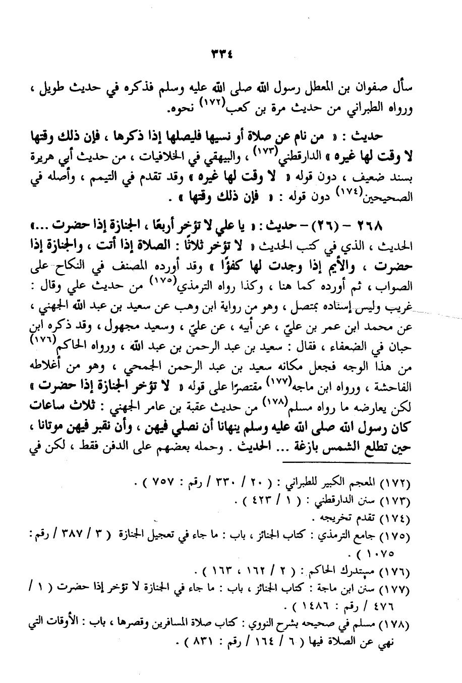 268 - (26) - حَدِيثٌ: «يَا عَلِيُّ لَا تُؤَخِّرْ أَرْبَعًا، الْجِنَازَةَ إذَا حَضَرَتْ. . .» الْحَدِيثَ، الَّذِي فِي كُتُبِ الْحَدِيثِ «لَا تُؤَخِّرْ ثَلَاثًا: الصَّلَاةَ إذَا أَتَتْ، وَالْجِنَازَةَ إذَا حَضَرَتْ، وَالْأَيِّمَ إذَا وَجَدْت لَهَا كُفْئًا» وَقَدْ أَوْرَدَهُ الْمُصَنِّفُ فِي النِّكَاحِ عَلَى الصَّوَابِ، ثُمَّ أَوْرَدَهُ كَمَا هُنَا، وَكَذَا رَوَاهُ التِّرْمِذِيُّ مِنْ حَدِيثِ عَلِيٍّ وَقَالَ: غَرِيبٌ وَلَيْسَ إسْنَادُهُ بِمُتَّصِلٍ، وَهُوَ مِنْ رِوَايَةِ ابْنِ وَهْبٍ عَنْ سَعِيدِ بْنِ عَبْدِ اللَّهِ الْجُهَنِيِّ، عَنْ مُحَمَّدِ بْنِ عُمَرَ بْنِ عَلِيٍّ، عَنْ أَبِيهِ، عَنْ عَلِيٍّ، وَسَعِيدٌ مَجْهُولٌ، وَقَدْ ذَكَرَهُ ابْنُ حِبَّانَ فِي الضُّعَفَاءِ، فَقَالَ: سَعِيدُ بْنُ عَبْدِ الرَّحْمَنِ بْنِ عَبْدِ اللَّهِ، وَرَوَاهُ الْحَاكِمُ مِنْ هَذَا الْوَجْهِ فَجَعَلَ مَكَانَهُ سَعِيدَ بْنَ عَبْدِ الرَّحْمَنِ الْجُمَحِيَّ، وَهُوَ مِنْ أَغْلَاطِهِ الْفَاحِشَةِ.