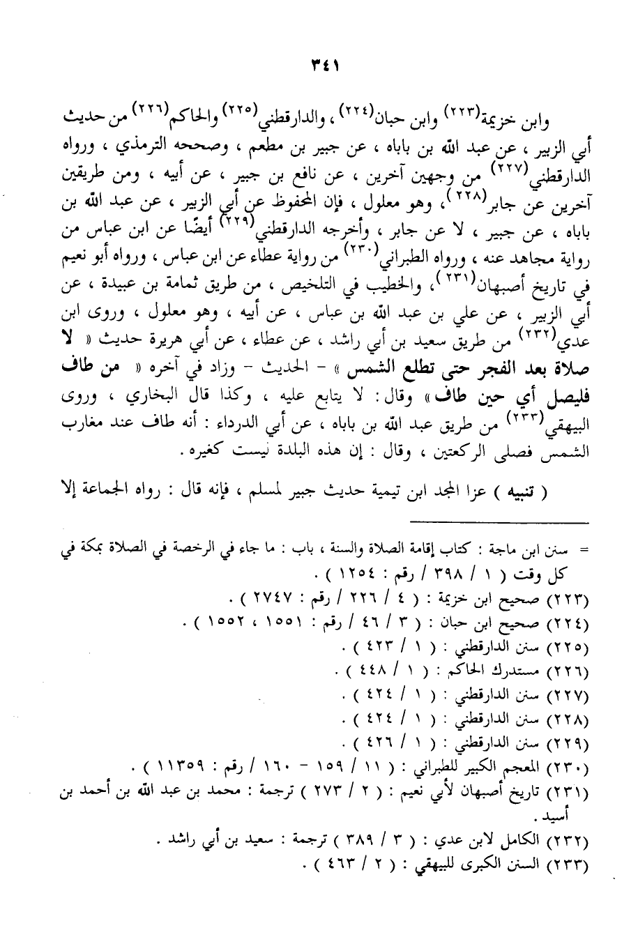 وَابْنُ خُزَيْمَةَ وَابْنُ حِبَّانَ، وَالدَّارَقُطْنِيّ وَالْحَاكِمُ مِنْ حَدِيثِ أَبِي الزُّبَيْرِ، عَنْ عَبْدِ اللَّهِ بْنِ بَابَاهُ، عَنْ جُبَيْرِ بْنِ مُطْعِمٍ، وَصَحَّحَهُ التِّرْمِذِيُّ، وَرَوَاهُ الدَّارَقُطْنِيُّ مِنْ وَجْهَيْنِ آخَرَيْنِ، عَنْ نَافِعِ بْنِ جُبَيْرٍ، عَنْ أَبِيهِ، وَمِنْ طَرِيقَيْنِ آخَرَيْنِ عَنْ جَابِرٍ، وَهُوَ مَعْلُولٌ، فَإِنَّ الْمَحْفُوظَ عَنْ أَبِي الزُّبَيْرِ، عَنْ عَبْدِ اللَّهِ بْنِ بَابَاهُ، عَنْ جُبَيْرٍ، لَا عَنْ جَابِرٍ، وَأَخْرَجَهُ الدَّارَقُطْنِيُّ ثُمَّ أَيْضًا عَنْ ابْنِ عَبَّاسٍ مِنْ رِوَايَةِ مُجَاهِدٍ عَنْهُ، وَرَوَاهُ الطَّبَرَانِيُّ مِنْ رِوَايَةِ عَطَاءٍ عَنْ ابْنِ عَبَّاسٍ، وَرَوَاهُ أَبُو نُعَيْمٍ فِي تَارِيخِ أَصْبَهَانَ، وَالْخَطِيبُ فِي التَّلْخِيصِ، مِنْ طَرِيقِ ثُمَامَةَ بْنِ عُبَيْدَةَ، عَنْ أَبِي الزُّبَيْرِ، عَنْ عَلِيِّ بْنِ عَبْدِ اللَّهِ بْنِ عَبَّاسٍ، عَنْ أَبِيهِ، وَهُوَ مَعْلُولٌ.