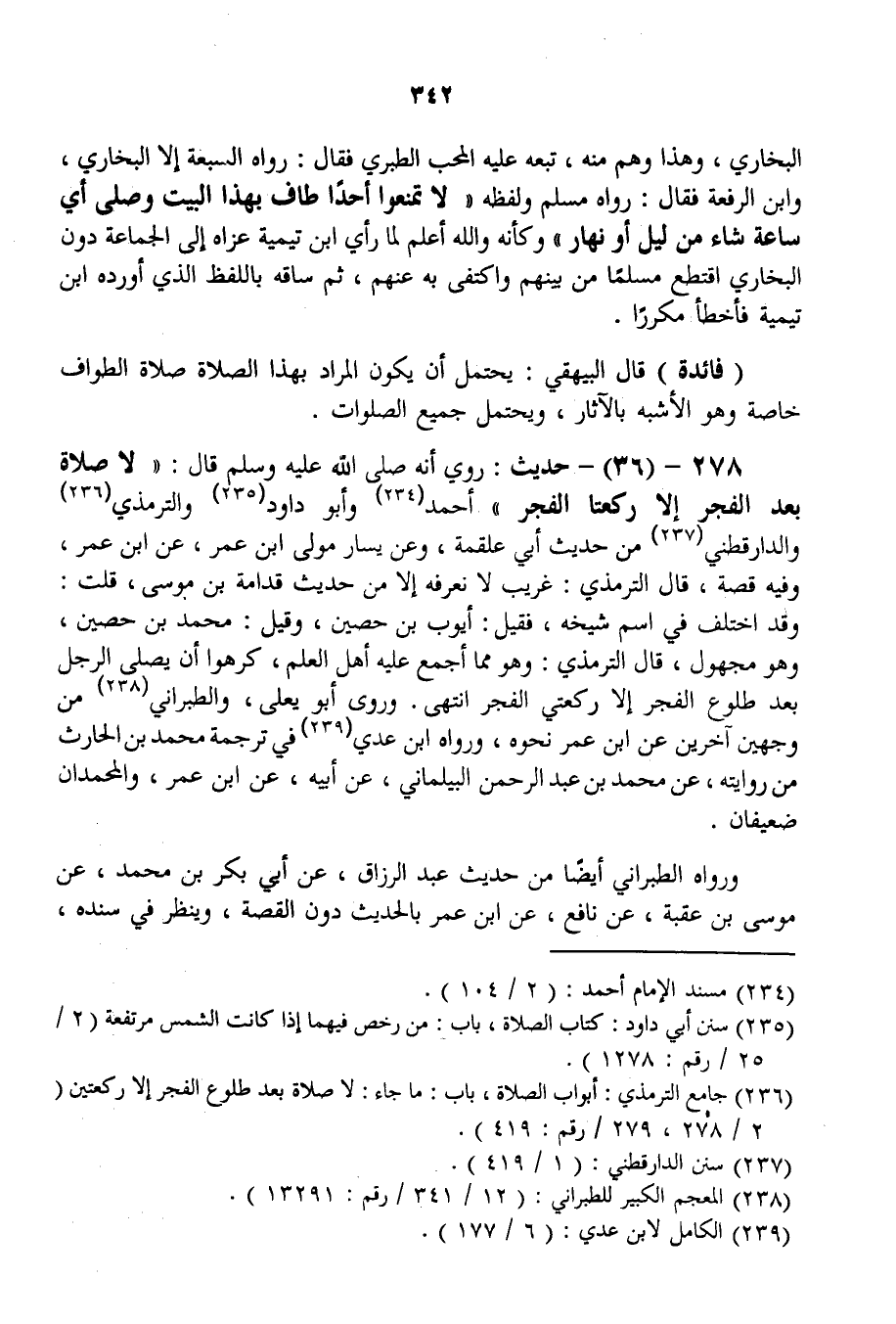 278 - (36) - حَدِيثٌ: رُوِيَ أَنَّهُ - صَلَّى اللَّهُ عَلَيْهِ وَسَلَّمَ - قَالَ: «لَا صَلَاةَ بَعْدَ الْفَجْرِ إلَّا رَكْعَتَا الْفَجْرِ» أَحْمَدُ وَأَبُو دَاوُد وَالتِّرْمِذِيُّ وَالدَّارَقُطْنِيُّ مِنْ حَدِيثِ أَبِي عَلْقَمَةَ، وَعَنْ يَسَارٍ مَوْلَى ابْنِ عُمَرَ، عَنْ ابْنِ عُمَرَ، وَفِيهِ قِصَّةٌ، قَالَ التِّرْمِذِيُّ: غَرِيبٌ لَا نَعْرِفُهُ إلَّا مِنْ حَدِيثِ قُدَامَةَ بْنِ مُوسَى، قُلْت: وَقَدْ اُخْتُلِفَ فِي اسْمِ شَيْخِهِ، فَقِيلَ: أَيُّوبُ بْنُ حُصَيْنٍ، وَقِيلَ: مُحَمَّدُ بْنُ حُصَيْنٍ، وَهُوَ مَجْهُولٌ، قَالَ التِّرْمِذِيُّ: وَهُوَ مِمَّا أَجْمَعَ عَلَيْهِ أَهْلُ الْعِلْمِ، كَرِهُوا أَنْ يُصَلِّيَ الرَّجُلُ بَعْدَ طُلُوعِ الْفَجْرِ إلَّا رَكْعَتَيْ الْفَجْرِ انْتَهَى.
