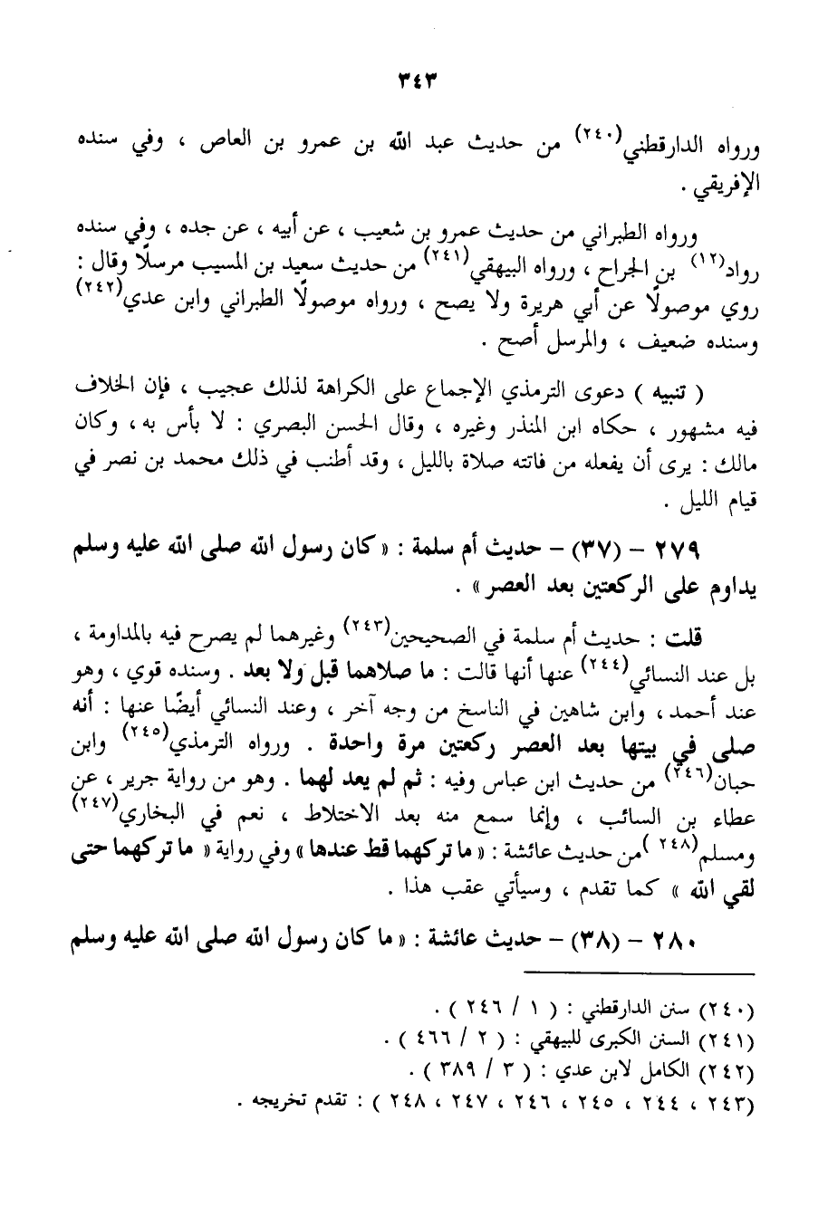 279 - (37) - حَدِيثُ أُمِّ سَلَمَةَ: «كَانَ رَسُولُ اللَّهِ - صَلَّى اللَّهُ عَلَيْهِ وَسَلَّمَ - يُدَاوِمُ عَلَى الرَّكْعَتَيْنِ بَعْدَ الْعَصْرِ» . قُلْت: حَدِيثُ أُمِّ سَلَمَةَ فِي الصَّحِيحَيْنِ وَغَيْرِهِمَا لَمْ يُصَرَّحْ فِيهِ بِالْمُدَاوَمَةِ، بَلْ عِنْدَ النَّسَائِيّ عَنْهَا أَنَّهَا قَالَتْ: مَا صَلَّاهُمَا قَبْلُ وَلَا بَعْدُ. وَسَنَدُهُ قَوِيٌّ، وَهُوَ عِنْدَ أَحْمَدَ، وَابْنِ شَاهِينَ فِي النَّاسِخِ مِنْ وَجْهٍ آخَرَ، وَعِنْدَ النَّسَائِيّ أَيْضًا عَنْهَا: «أَنَّهُ صَلَّى فِي بَيْتِهَا بَعْدَ الْعَصْرِ رَكْعَتَيْنِ مَرَّةً وَاحِدَةً» . وَرَوَاهُ التِّرْمِذِيُّ وَابْنُ حِبَّانَ مِنْ حَدِيثِ ابْنِ عَبَّاسٍ وَفِيهِ: «ثُمَّ لَمْ يَعُدْ لَهُمَا» . وَهُوَ مِنْ رِوَايَةِ جَرِيرٍ، عَنْ عَطَاءِ بْنِ السَّائِبِ، وَإِنَّمَا سَمِعَ مِنْهُ بَعْدَ الِاخْتِلَاطِ، نَعَمْ فِي الْبُخَارِيِّ وَمُسْلِمٍ مِنْ حَدِيثِ عَائِشَةَ: «مَا تَرَكَهُمَا قَطُّ عِنْدَهَا» وَفِي رِوَايَةٍ «مَا تَرَكَهُمَا حَتَّى لَقِيَ اللَّهَ» كَمَا تَقَدَّمَ، وَسَيَأْتِي عَقِبَ هَذَا