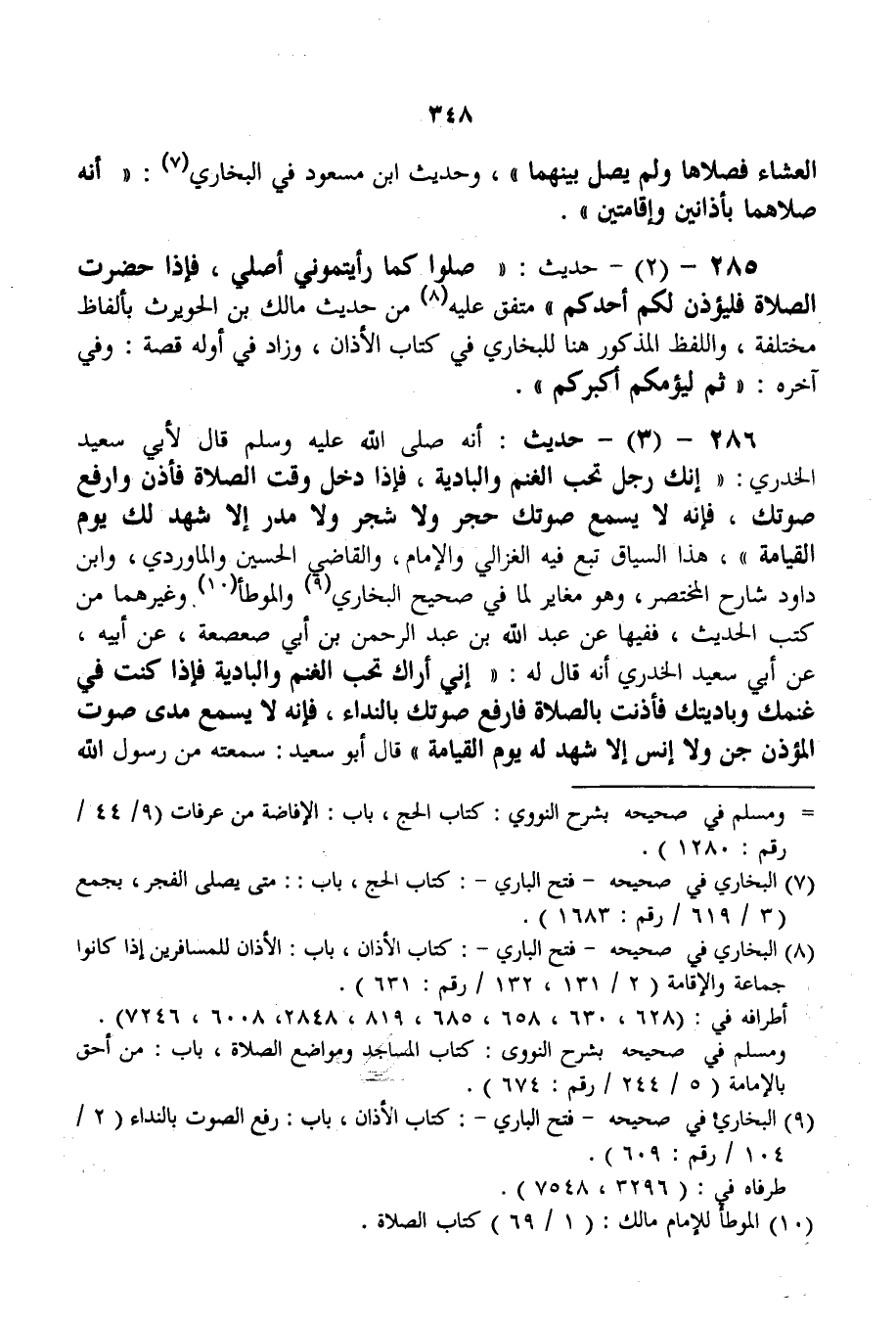 286 - (3) - حَدِيثُ: «أَنَّهُ - صَلَّى اللَّهُ عَلَيْهِ وَسَلَّمَ - قَالَ لِأَبِي سَعِيدٍ الْخُدْرِيِّ: إنَّك رَجُلٌ تُحِبُّ الْغَنَمَ وَالْبَادِيَةَ، فَإِذَا دَخَلَ وَقْتُ الصَّلَاةِ فَأَذِّنْ وَارْفَعْ صَوْتَك، فَإِنَّهُ لَا يَسْمَعُ صَوْتَك حَجَرٌ وَلَا شَجَرٌ وَلَا مَدَرٌ إلَّا شَهِدَ لَك يَوْمَ الْقِيَامَةِ» ، هَذَا السِّيَاقُ تَبِعَ فِيهِ الْغَزَالِيُّ وَالْإِمَامُ، وَالْقَاضِي الْحُسَيْنُ وَالْمَاوَرْدِيُّ، وَابْنُ دَاوُد شَارِحُ الْمُخْتَصَرِ، وَهُوَ مُغَايِرٌ لِمَا فِي صَحِيحِ الْبُخَارِيِّ وَالْمُوَطَّأِ. وَغَيْرِهِمَا مِنْ كُتُبِ الْحَدِيثِ، فَفِيهَا عَنْ عَبْدِ اللَّهِ بْنِ عَبْدِ الرَّحْمَنِ بْنِ أَبِي صَعْصَعَةَ، عَنْ أَبِيهِ، عَنْ أَبِي سَعِيدٍ الْخُدْرِيِّ أَنَّهُ قَالَ لَهُ: «إنِّي أَرَاك تُحِبُّ الْغَنَمَ وَالْبَادِيَةَ فَإِذَا كُنْت فِي غَنَمِك وَبَادِيَتِك فَأَذَّنْت بِالصَّلَاةِ فَارْفَعْ صَوْتَك بِالنِّدَاءِ، فَإِنَّهُ لَا يَسْمَعُ مَدَى صَوْتِ الْمُؤَذِّنِ جِنٌّ وَلَا إنْسٌ إلَّا شَهِدَ لَهُ يَوْمَ الْقِيَامَةِ» قَالَ أَبُو سَعِيدٍ: سَمِعْته مِنْ رَسُولِ اللَّهِ