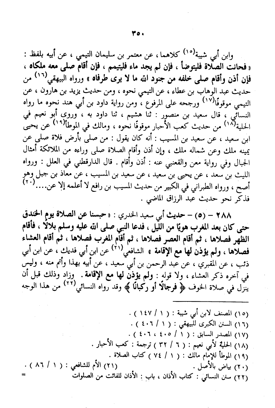 288 - (5) - حَدِيثُ أَبِي سَعِيدٍ الْخُدْرِيِّ: «حُبِسْنَا عَنْ الصَّلَاةِ يَوْمَ الْخَنْدَقِ حَتَّى كَانَ بَعْدَ الْمَغْرِبِ هَوِيًّا مِنْ اللَّيْلِ، فَدَعَا النَّبِيُّ - صَلَّى اللَّهُ عَلَيْهِ وَسَلَّمَ - بِلَالًا، فَأَقَامَ الظُّهْرَ فَصَلَّاهَا، ثُمَّ أَقَامَ الْعَصْرَ فَصَلَّاهَا، ثُمَّ أَقَامَ الْمَغْرِبَ فَصَلَّاهَا، ثُمَّ أَقَامَ الْعِشَاءَ فَصَلَّاهَا، وَلَمْ يُؤَذِّنْ لَهَا مَعَ الْإِقَامَةِ» الشَّافِعِيُّ عَنْ ابْنِ أَبِي فُدَيْكٍ، عَنْ ابْنِ أَبِي ذِئْبٍ، عَنْ الْمَقْبُرِيِّ، عَنْ عَبْدِ الرَّحْمَنِ بْنِ أَبِي سَعِيدٍ، عَنْ أَبِيهِ بِهَذَا وَأَتَمَّ مِنْهُ، وَلَيْسَ فِي آخِرِهِ ذِكْرُ الْعِشَاءِ، وَلَا قَوْلُهُ: وَلَمْ يُؤَذِّنْ لَهَا مَعَ الْإِقَامَةِ. وَزَادَ «وَذَلِكَ قَبْلَ أَنْ يَنْزِلَ فِي صَلَاةِ الْخَوْفِ {فَرِجَالا أَوْ رُكْبَانًا} [البقرة: 239] » وَقَدْ رَوَاهُ النَّسَائِيَّ مِنْ هَذَا الْوَجْهِ
