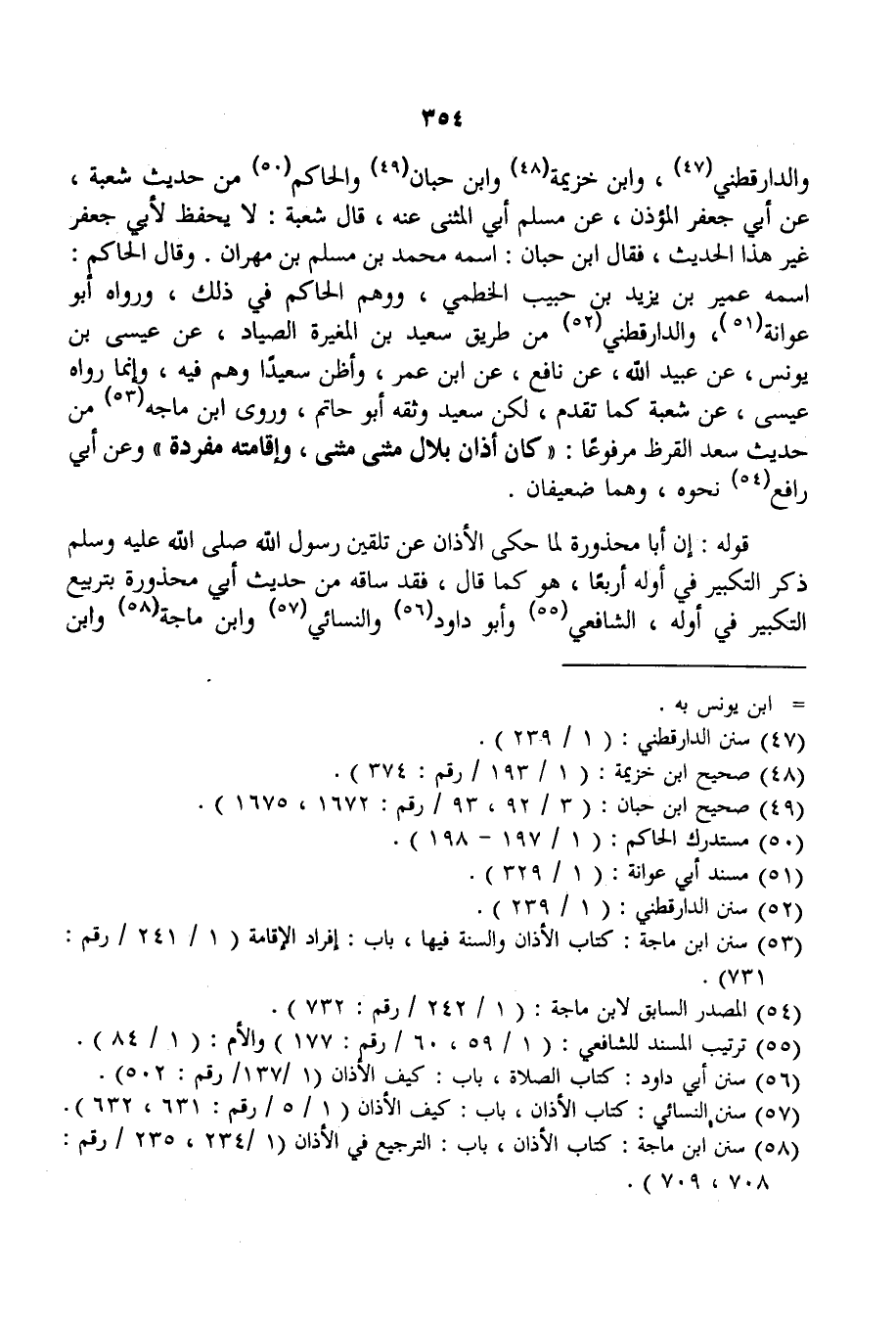 وَرَوَى ابْنُ مَاجَهْ مِنْ حَدِيثِ سَعْدِ الْقَرْظِ مَرْفُوعًا: «كَانَ أَذَانُ بِلَالٍ مَثْنَى مَثْنَى، وَإِقَامَتُهُ مُفْرَدَةً» وَعَنْ أَبِي رَافِعٍ نَحْوُهُ، وَهُمَا ضَعِيفَانِ. قَوْلُهُ: إنَّ أَبَا مَحْذُورَةَ لَمَّا حَكَى الْأَذَانَ عَنْ تَلْقِينِ رَسُولِ اللَّهِ - صَلَّى اللَّهُ عَلَيْهِ وَسَلَّمَ - ذَكَرَ التَّكْبِيرَ فِي أَوَّلِهِ أَرْبَعًا، هُوَ كَمَا قَالَ، فَقَدْ سَاقَهُ مِنْ حَدِيثِ أَبِي مَحْذُورَةَ بِتَرْبِيعِ التَّكْبِيرِ فِي أَوَّلِهِ، الشَّافِعِيُّ وَأَبُو دَاوُد وَالنَّسَائِيُّ وَابْنُ مَاجَهْ