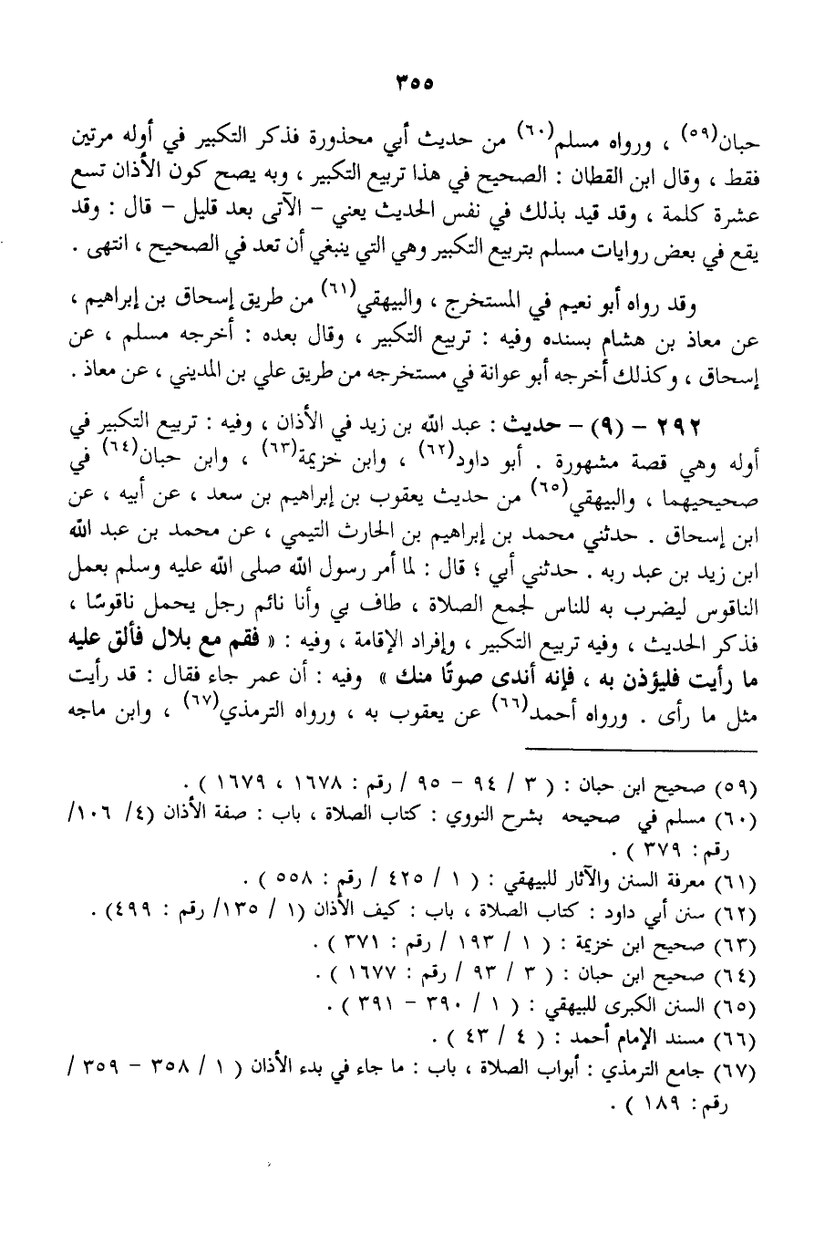 292 - (9) - حَدِيثُ: عَبْدِ اللَّهِ بْنِ زَيْدٍ فِي الْأَذَانِ، وَفِيهِ: تَرْبِيعُ التَّكْبِيرِ فِي أَوَّلِهِ وَهِيَ قِصَّةٌ مَشْهُورَةٌ. أَبُو دَاوُد، وَابْنُ خُزَيْمَةَ، وَابْنُ حِبَّانَ فِي صَحِيحَيْهِمَا، وَالْبَيْهَقِيُّ مِنْ حَدِيثِ يَعْقُوبَ بْنِ إبْرَاهِيمَ بْنِ سَعْدٍ، عَنْ أَبِيهِ، عَنْ ابْنِ إِسْحَاقَ حَدَّثَنِي مُحَمَّدُ بْنُ إبْرَاهِيمَ بْنِ الْحَارِثِ التَّيْمِيُّ، عَنْ مُحَمَّدِ بْنِ عَبْدِ اللَّهِ بْنِ زَيْدِ بْنِ عَبْدِ رَبِّهِ. حَدَّثَنِي أَبِي؛ قَالَ: «لَمَّا أَمَرَ رَسُولُ اللَّهِ - صَلَّى اللَّهُ عَلَيْهِ وَسَلَّمَ - بِعَمَلِ النَّاقُوسِ لِيُضْرَبَ بِهِ لِلنَّاسِ لِجَمْعِ الصَّلَاةِ، طَافَ بِي وَأَنَا نَائِمٌ رَجُلٌ يَحْمِلُ نَاقُوسًا» ، فَذَكَرَ الْحَدِيثَ، وَفِيهِ تَرْبِيعُ التَّكْبِيرِ، وَإِفْرَادُ الْإِقَامَةِ، وَفِيهِ: «فَقُمْ مَعَ بِلَالٍ فَأَلْقِ عَلَيْهِ مَا رَأَيْت فَلْيُؤَذِّنْ بِهِ، فَإِنَّهُ أَنْدَى صَوْتًا مِنْك» وَفِيهِ: «أَنَّ عُمَرَ جَاءَ فَقَالَ: قَدْ رَأَيْت مِثْلَ مَا رَأَى» . وَرَوَاهُ أَحْمَدُ عَنْ يَعْقُوبَ بِهِ، وَرَوَاهُ التِّرْمِذِيُّ، وَابْنُ مَاجَهْ