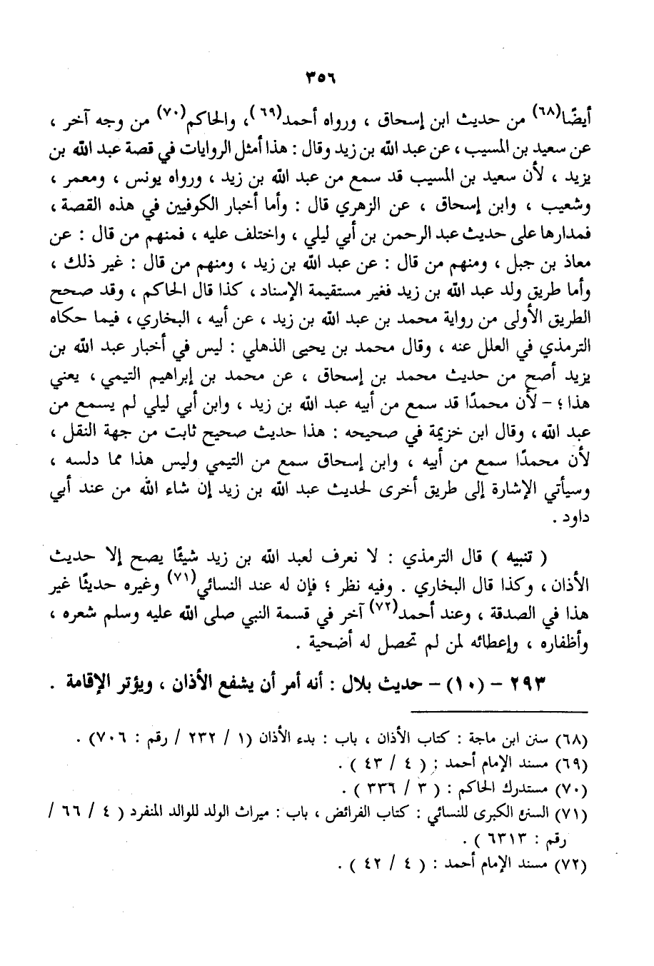 أَيْضًا مِنْ حَدِيثِ ابْنِ إِسْحَاقَ، وَرَوَاهُ أَحْمَدُ، وَالْحَاكِمُ مِنْ وَجْهٍ آخَرَ، عَنْ سَعِيدِ بْنِ الْمُسَيِّبِ، عَنْ عَبْدِ اللَّهِ بْنِ زَيْدٍ وَقَالَ: هَذَا أَمْثَلُ الرِّوَايَاتِ فِي قِصَّةِ عَبْدِ اللَّهِ بْنِ يَزِيدَ، لِأَنَّ سَعِيدَ بْنَ الْمُسَيِّبِ قَدْ سَمِعَ مِنْ عَبْدِ اللَّهِ بْنِ زَيْدٍ، وَرَوَاهُ يُونُسُ، وَمَعْمَرٌ، وَشُعَيْبٌ، وَابْنُ إِسْحَاقَ، عَنْ الزُّهْرِيِّ قَالَ: وَأَمَّا أَخْبَارُ الْكُوفِيِّينَ فِي هَذِهِ الْقِصَّةِ، فَمَدَارُهَا عَلَى حَدِيثِ عَبْدِ الرَّحْمَنِ بْنِ أَبِي لَيْلَى، وَاخْتُلِفَ عَلَيْهِ، فَمِنْهُمْ مَنْ قَالَ: عَنْ مُعَاذِ بْنِ جَبَلٍ، وَمِنْهُمْ مَنْ قَالَ: عَنْ عَبْدِ اللَّهِ بْنِ زَيْدٍ، وَمِنْهُمْ مَنْ قَالَ غَيْرَ ذَلِكَ، وَأَمَّا طَرِيقُ وَلَدِ عَبْدِ اللَّهِ بْنِ زَيْدٍ فَغَيْرُ مُسْتَقِيمَةِ الْإِسْنَادِ، كَذَا قَالَ الْحَاكِمُ، وَقَدْ صَحَّحَ الطَّرِيقَ الْأُولَى مِنْ رِوَايَةِ مُحَمَّدِ بْنِ عَبْدِ اللَّهِ بْنِ زَيْدٍ، عَنْ أَبِيهِ الْبُخَارِيُّ، فِيمَا حَكَاهُ التِّرْمِذِيُّ فِي الْعِلَلِ عَنْهُ، وَقَالَ مُحَمَّدُ بْنُ يَحْيَى الذُّهْلِيُّ: لَيْسَ فِي أَخْبَارِ عَبْدِ اللَّهِ بْنِ يَزِيدَ أَصَحُّ مِنْ حَدِيثِ مُحَمَّدِ بْنِ إِسْحَاقَ، عَنْ مُحَمَّدِ بْنِ إبْرَاهِيمَ التَّيْمِيِّ، يَعْنِي هَذَا؛ لِأَنَّ مُحَمَّدًا قَدْ سَمِعَ مِنْ أَبِيهِ عَبْدِ اللَّهِ بْنِ زَيْدٍ، وَابْنَ أَبِي لَيْلَى لَمْ يَسْمَعْ مِنْ عَبْدِ اللَّهِ، وَقَالَ ابْنُ خُزَيْمَةَ فِي صَحِيحِهِ: هَذَا حَدِيثٌ صَحِيحٌ ثَابِتٌ مِنْ جِهَةِ النَّقْلِ، لِأَنَّ مُحَمَّدًا سَمِعَ مِنْ أَبِيهِ، وَابْنَ إِسْحَاقَ سَمِعَ مِنْ التَّيْمِيِّ وَلَيْسَ هَذَا مِمَّا دَلَّسَهُ، وَسَيَأْتِي الْإِشَارَةُ إلَى طَرِيقٍ أُخْرَى لِحَدِيثِ عَبْدِ اللَّهِ بْنِ زَيْدٍ إنْ شَاءَ اللَّهُ مِنْ عِنْدَ أَبِي دَاوُد.