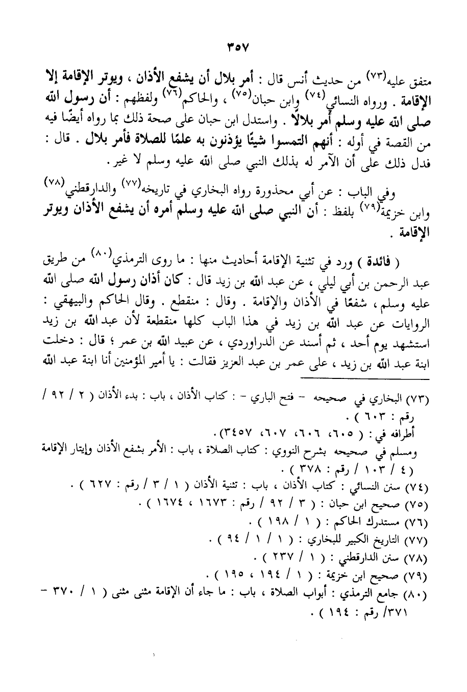 (فَائِدَةٌ) وَرَدَ فِي تَثْنِيَةِ الْإِقَامَةِ أَحَادِيثُ مِنْهَا: مَا رَوَى التِّرْمِذِيُّ مِنْ طَرِيقِ عَبْدِ الرَّحْمَنِ بْنِ أَبِي لَيْلَى، عَنْ عَبْدِ اللَّهِ بْنِ زَيْدٍ قَالَ: «كَانَ أَذَانُ رَسُولِ اللَّهِ - صَلَّى اللَّهُ عَلَيْهِ وَسَلَّمَ - شَفْعًا فِي الْأَذَانِ وَالْإِقَامَةِ» وَقَالَ: مُنْقَطِعٌ. وَقَالَ الْحَاكِمُ وَالْبَيْهَقِيُّ: الرِّوَايَاتُ عَنْ عَبْدِ اللَّهِ بْنِ زَيْدٍ فِي هَذَا الْبَابِ كُلُّهَا مُنْقَطِعَةٌ لِأَنَّ عَبْدَ اللَّهِ بْنَ زَيْدٍ اُسْتُشْهِدَ يَوْمَ أُحُدٍ، ثُمَّ أَسْنَدَ عَنْ الدَّرَاوَرْدِيِّ، عَنْ عُبَيْدِ اللَّهِ بْنِ عُمَرَ؛ قَالَ: دَخَلَتْ ابْنَةُ عَبْدِ اللَّهِ بْنِ زَيْدٍ، عَلَى عُمَرَ بْنِ عَبْدِ الْعَزِيزِ فَقَالَتْ: يَا أَمِيرَ الْمُؤْمِنِينَ أَنَا ابْنَةُ