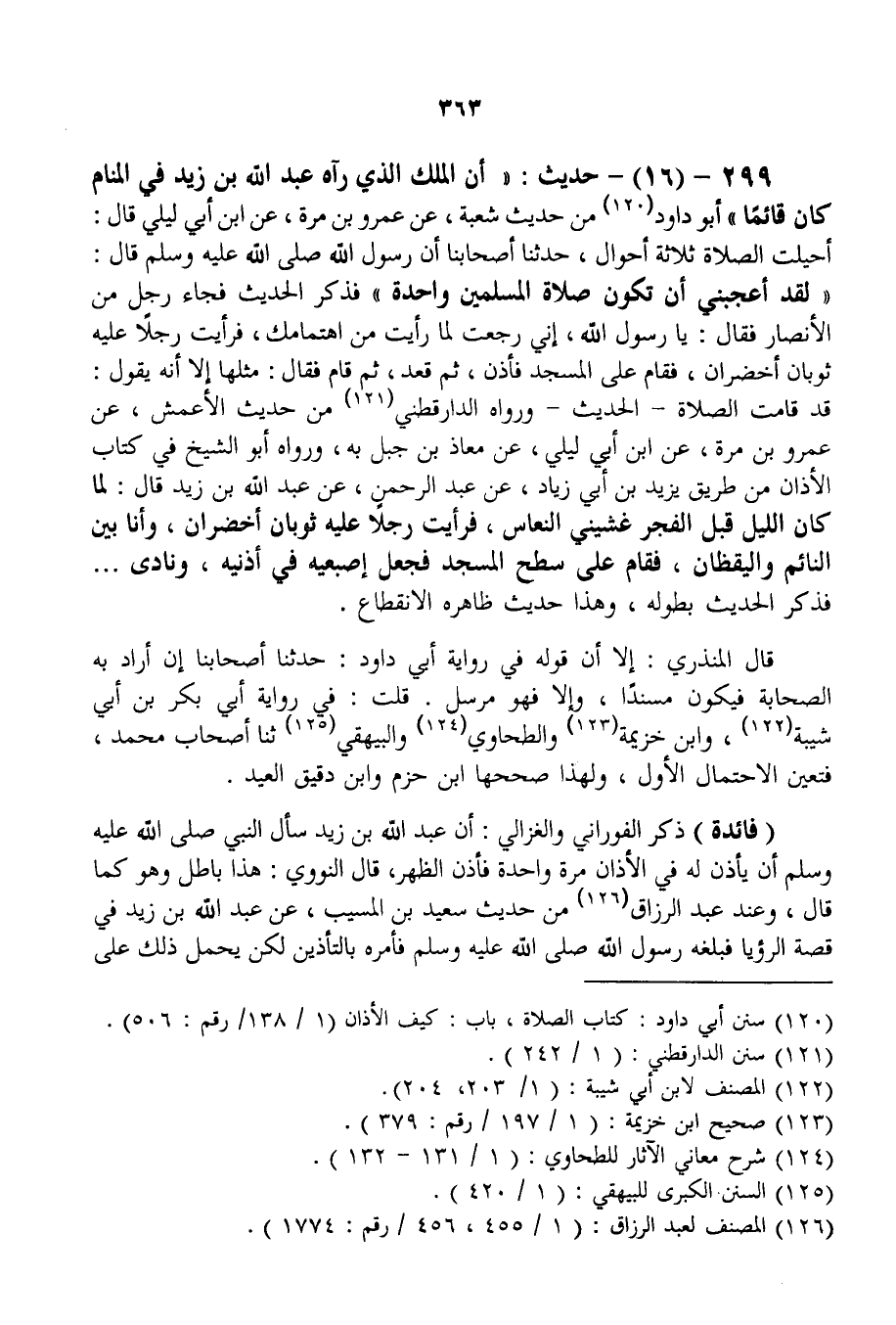 حَدِيثُ: «أَنَّ الْمَلَكَ الَّذِي رَآهُ عَبْدُ اللَّهِ بْنُ زَيْدٍ فِي الْمَنَامِ كَانَ قَائِمًا» أَبُو دَاوُد مِنْ حَدِيثِ شُعْبَةَ عَنْ عَمْرِو بْنِ مُرَّةَ عَنْ ابْنِ أَبِي لَيْلَى قَالَ: أُحِيلَتْ الصَّلَاةُ ثَلَاثَةَ أَحْوَالٍ، حَدَّثَنَا أَصْحَابُنَا «أَنَّ رَسُولَ اللَّهِ - صَلَّى اللَّهُ عَلَيْهِ وَسَلَّمَ - قَالَ: لَقَدْ أَعْجَبَنِي أَنْ تَكُونَ صَلَاةُ الْمُسْلِمِينَ وَاحِدَةً فَذَكَرَ الْحَدِيثَ فَجَاءَ رَجُلٌ مِنْ الْأَنْصَارِ فَقَالَ: يَا رَسُولَ اللَّهِ، إنِّي رَجَعْتُ لِمَا رَأَيْتُ مِنْ اهْتِمَامِكَ، فَرَأَيْتُ رَجُلًا عَلَيْهِ ثَوْبَانِ أَخْضَرَانِ، فَقَامَ عَلَى الْمَسْجِدِ فَأَذَّنَ، ثُمَّ قَعَدَ، ثُمَّ قَامَ فَقَالَ: مِثْلَهَا إلَّا أَنَّهُ يَقُولُ: قَدْ قَامَتْ الصَّلَاةُ» - الْحَدِيثُ - وَرَوَاهُ الدَّارَقُطْنِيُّ مِنْ حَدِيثِ الْأَعْمَشِ عَنْ عَمْرِو بْنِ مُرَّةَ عَنْ ابْنِ أَبِي لَيْلَى عَنْ مُعَاذِ بْنِ جَبَلٍ بِهِ، وَرَوَاهُ أَبُو الشَّيْخِ فِي كِتَابِ الْأَذَانِ مِنْ طَرِيقِ يَزِيدَ بْنِ أَبِي زِيَادٍ عَنْ عَبْدِ الرَّحْمَنِ، عَنْ عَبْدِ اللَّهِ بْنِ زَيْدٍ قَالَ: «لَمَّا كَانَ اللَّيْلُ قَبْلَ الْفَجْرِ غَشِيَنِي النُّعَاسُ، فَرَأَيْتُ رَجُلًا عَلَيْهِ ثَوْبَانِ أَخْضَرَانِ، وَأَنَا بَيْنَ النَّائِمِ وَالْيَقْظَانِ، فَقَامَ عَلَى سَطْحِ الْمَسْجِدِ فَجَعَلَ أُصْبُعَيْهِ فِي أُذُنَيْهِ، وَنَادَى. . .» فَذَكَرَ الْحَدِيثَ بِطُولِهِ، وَهَذَا حَدِيثٌ ظَاهِرُهُ الِانْقِطَاعُ. قَالَ الْمُنْذِرِيُّ: إلَّا أَنَّ قَوْلَهُ فِي رِوَايَةِ أَبِي دَاوُد: حَدَّثَنَا أَصْحَابُنَا إنْ أَرَادَ بِهِ الصَّحَابَةَ فَيَكُونُ مُسْنَدًا، وَإِلَّا فَهُوَ مُرْسَلٌ. قُلْتُ: فِي رِوَايَةِ أَبِي بَكْرِ بْنِ أَبِي شَيْبَةَ، وَابْنِ خُزَيْمَةَ وَالطَّحَاوِيِّ وَالْبَيْهَقِيِّ ثَنَا أَصْحَابُ مُحَمَّدٍ، فَتَعَيَّنَ الِاحْتِمَالُ الْأَوَّلُ، وَلِهَذَا صَحَّحَهَا ابْنُ حَزْمٍ وَابْنُ دَقِيقِ الْعِيدِ.
