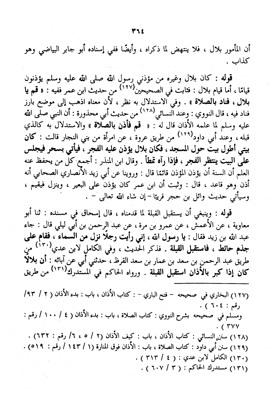 أَنَّ الْمَأْمُورَ بِلَالٌ، فَلَا يَنْتَهِضُ لِمَا ذَكَرَاهُ، وَأَيْضًا فَفِي إسْنَادِهِ أَبُو جَابِرٍ الْبَيَاضِيُّ وَهُوَ كَذَّابٌ. قَوْلُهُ: «كَانَ بِلَالٌ وَغَيْرُهُ مِنْ مُؤَذِّنِي رَسُولِ اللَّهِ - صَلَّى اللَّهُ عَلَيْهِ وَسَلَّمَ - يُؤَذِّنُونَ قِيَامًا» ، أَمَّا قِيَامُ بِلَالٍ: فَثَابِتٌ فِي الصَّحِيحَيْنِ مِنْ حَدِيثِ ابْنِ عُمَرَ فَفِيهِ: «قُمْ يَا بِلَالُ، فَنَادِ بِالصَّلَاةِ» . وَفِي الِاسْتِدْلَال بِهِ نَظَرٌ، لِأَنَّ مَعْنَاهُ اذْهَبْ إلَى مَوْضِعٍ بَارِزٍ فَنَادِ فِيهِ، قَالَ النَّوَوِيُّ: وَعِنْدَ النَّسَائِيّ مِنْ حَدِيثِ أَبِي مَحْذُورَةَ: «أَنَّ النَّبِيَّ - صَلَّى اللَّهُ عَلَيْهِ وَسَلَّمَ - لَمَّا عَلَّمَهُ الْأَذَانَ قَالَ لَهُ: قُمْ فَأَذِّنْ بِالصَّلَاةِ» وَالِاسْتِدْلَالُ بِهِ كَاَلَّذِي قَبْلَهُ، وَعِنْدِ أَبِي دَاوُد مِنْ طَرِيقِ عُرْوَةَ، عَنْ امْرَأَة مِنْ بَنِي النَّجَّارِ قَالَتْ: «كَانَ بَيْتِي أَطْوَلَ بَيْتٍ حَوْلَ الْمَسْجِدِ، فَكَانَ بِلَالٌ يُؤَذِّنُ عَلَيْهِ الْفَجْرَ، فَيَأْتِي بِسَحَرٍ فَيَجْلِسُ عَلَى الْبَيْتِ يَنْتَظِرُ الْفَجْرَ، فَإِذَا رَآهُ تَمَطَّأَ» . وَقَالَ ابْنُ الْمُنْذِرِ: أَجْمَعَ كُلُّ مَنْ يُحْفَظُ عَنْهُ الْعِلْمُ أَنَّ السُّنَّةَ أَنْ يُؤَذِّنَ الْمُؤَذِّنُ قَائِمًا قَالَ: وَرَوَيْنَا عَنْ أَبِي زَيْدٍ الْأَنْصَارِيِّ الصَّحَابِيِّ أَنَّهُ أَذَّنَ وَهُوَ قَاعِدٌ، قَالَ: وَثَبَتَ أَنَّ ابْنَ عُمَرَ كَانَ يُؤَذِّنُ عَلَى الْبَعِيرِ، وَيَنْزِلُ فَيُقِيمُ، وَسَيَأْتِي حَدِيثُ وَائِلِ بْنِ حُجْرٍ قَرِيبًا - إنْ شَاءَ اللَّهُ تَعَالَى -. قَوْلُهُ: وَيَنْبَغِي أَنْ يَسْتَقْبِلَ الْقِبْلَةَ لِمَا قَدَّمْنَاهُ، قَالَ إِسْحَاقُ فِي مُسْنَدِهِ: ثَنَا أَبُو مُعَاوِيَةَ عَنْ الْأَعْمَشِ عَنْ عَمْرِو بْنِ مُرَّةَ عَنْ عَبْدِ الرَّحْمَنِ بْنِ أَبِي لَيْلَى قَالَ: «جَاءَ عَبْدُ اللَّهِ بْنُ زَيْدٍ فَقَالَ: يَا رَسُولَ اللَّهِ، إنِّي رَأَيْتُ رَجُلًا نَزَلَ مِنْ السَّمَاءِ، فَقَامَ عَلَى جِذْمِ حَائِطٍ، فَاسْتَقْبَلَ الْقِبْلَةَ» . فَذَكَرَ الْحَدِيثَ، وَفِي الْكَامِلِ لِابْنِ عَدِيٍّ مِنْ طَرِيقِ عَبْدِ الرَّحْمَنِ بْنِ سَعْدِ بْنِ عَمَّارِ بْنِ سَعْدِ الْقَرَظِ، حَدَّثَنِي أَبِي عَنْ آبَائِهِ: «أَنَّ بِلَالًا كَانَ إذَا كَبَّرَ بِالْأَذَانِ اسْتَقْبَلَ الْقِبْلَةَ» . وَرَوَاهُ الْحَاكِمُ فِي الْمُسْتَدْرَكِ مِنْ طَرِيقِ