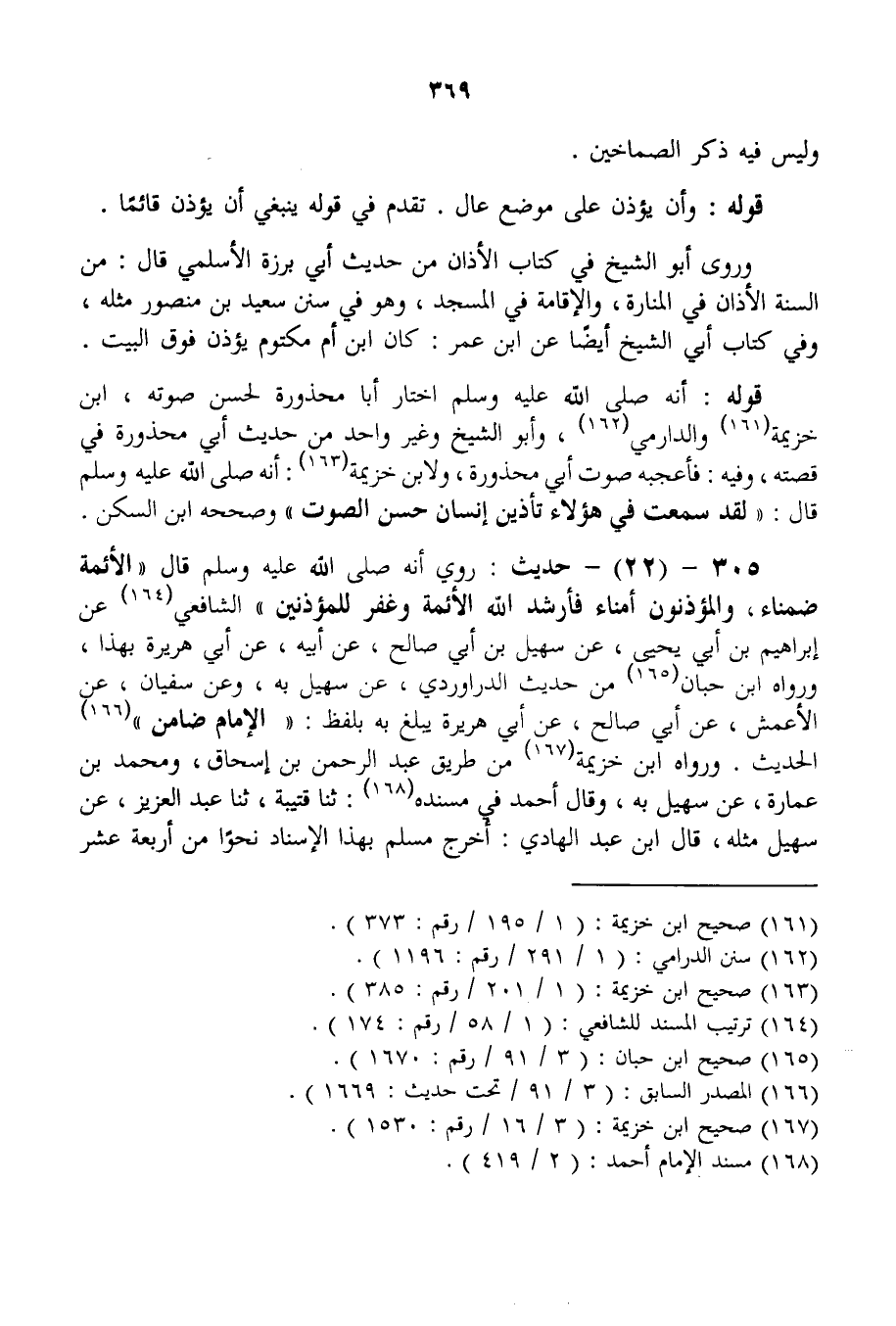 305 - (22) - حَدِيثُ: رُوِيَ أَنَّهُ - صَلَّى اللَّهُ عَلَيْهِ وَسَلَّمَ - قَالَ «الْأَئِمَّةُ ضُمَنَاءُ، وَالْمُؤَذِّنُونَ أُمَنَاءُ فَأَرْشَدَ اللَّهُ الْأَئِمَّةَ وَغَفَرَ لِلْمُؤَذِّنِينَ» الشَّافِعِيُّ عَنْ إبْرَاهِيمَ بْنِ أَبِي يَحْيَى عَنْ سُهَيْلِ بْنِ أَبِي صَالِحٍ عَنْ أَبِيهِ عَنْ أَبِي هُرَيْرَةَ بِهَذَا، وَرَوَاهُ ابْنُ حِبَّانَ مِنْ حَدِيثِ الدَّرَاوَرْدِيِّ عَنْ سُهَيْلٍ بِهِ، وَعَنْ سُفْيَانَ، عَنْ الْأَعْمَشِ عَنْ أَبِي صَالِحٍ عَنْ أَبِي هُرَيْرَةَ يُبَلِّغُ بِهِ بِلَفْظِ: «الْإِمَامُ ضَامِنٌ» الْحَدِيثُ. وَرَوَاهُ ابْنُ خُزَيْمَةَ مِنْ طَرِيقِ عَبْدِ الرَّحْمَنِ بْنِ إِسْحَاقَ، وَمُحَمَّدُ بْنُ عُمَارَةَ عَنْ سُهَيْلٍ بِهِ؛ وَقَالَ أَحْمَدُ فِي مُسْنَدِهِ: ثَنَا قُتَيْبَةُ، ثَنَا عَبْدُ الْعَزِيزِ عَنْ سُهَيْلٍ مِثْلَهُ، قَالَ ابْنُ عَبْدِ الْهَادِي: أَخْرَجَ مُسْلِمٌ بِهَذَا الْإِسْنَادِ نَحْوًا مِنْ أَرْبَعَةَ عَشَرَ