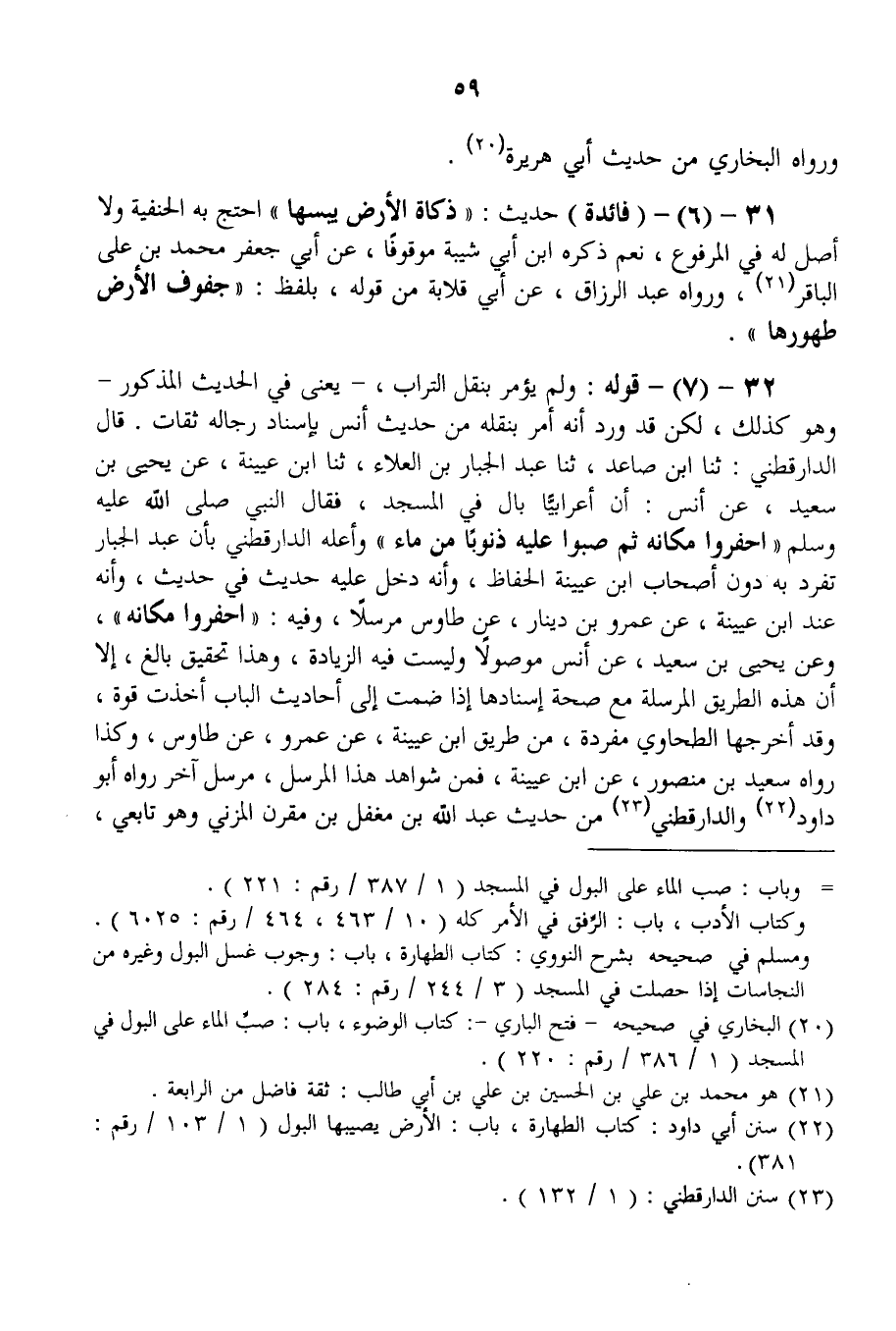 31 - (6) - (فَائِدَةٌ) حَدِيثُ: «ذَكَاةُ الْأَرْضِ يُبْسُهَا» احْتَجَّ بِهِ الْحَنَفِيَّةُ وَلَا أَصْلَ لَهُ فِي الْمَرْفُوعِ، نَعَمْ ذَكَرَهُ ابْنُ أَبِي شَيْبَةَ مَوْقُوفًا، عَنْ أَبِي جَعْفَرٍ مُحَمَّدِ بْنِ عَلِيٍّ الْبَاقِرِ، وَرَوَاهُ عَبْدُ الرَّزَّاقِ، عَنْ أَبِي قِلَابَةَ مِنْ قَوْلِهِ، بِلَفْظِ: " جُفُوفُ الْأَرْضِ طَهُورُهَا ". 32 - (7) - قَوْلُهُ: وَلَمْ يُؤْمَرْ بِنَقْلِ التُّرَابِ، - يَعْنِي فِي الْحَدِيثِ الْمَذْكُورِ - وَهُوَ كَذَلِكَ، لَكِنْ قَدْ وَرَدَ أَنَّهُ أَمَرَ بِنَقْلِهِ مِنْ حَدِيثِ أَنَسٍ بِإِسْنَادٍ رِجَالُهُ ثِقَاتٌ.