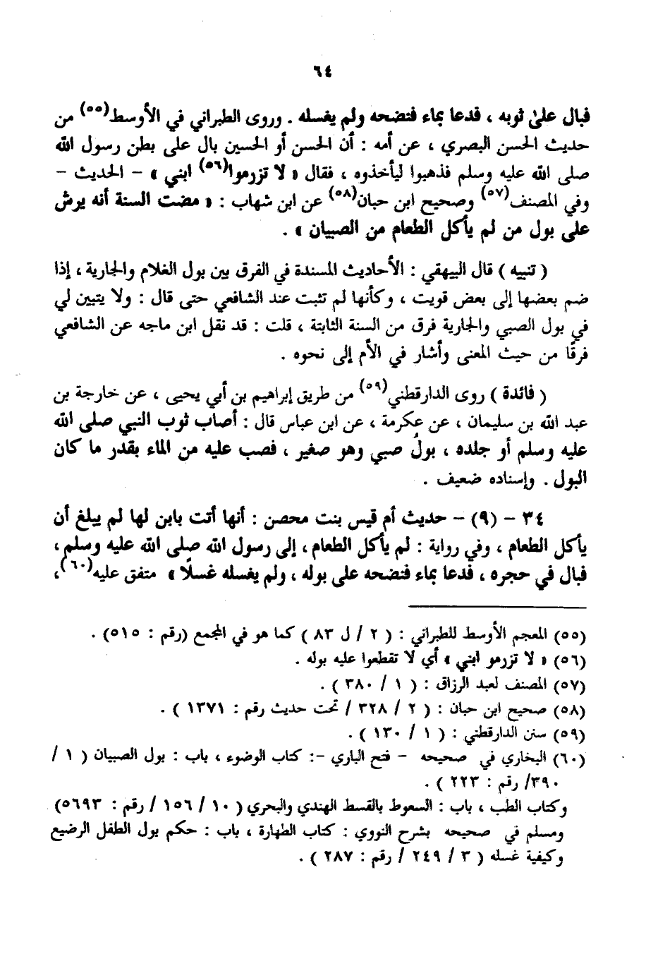 وَرَوَى الطَّبَرَانِيُّ فِي الْأَوْسَطِ مِنْ حَدِيثِ الْحَسَنِ الْبَصْرِيِّ، عَنْ أُمِّهِ: أَنَّ الْحَسَنَ أَوْ الْحُسَيْنَ بَالَ عَلَى بَطْنِ رَسُولِ اللَّهِ - صَلَّى اللَّهُ عَلَيْهِ وَسَلَّمَ - فَذَهَبُوا لِيَأْخُذُوهُ، فَقَالَ: " لَا تَزْرِمُوا ابْنِي " - الْحَدِيث - وَفِي الْمُصَنَّفِ وَصَحِيحِ ابْنِ حِبَّانَ عَنْ ابْنِ شِهَابٍ: «مَضَتْ السُّنَّةُ أَنَّهُ يُرَشُّ عَلَى بَوْلِ مَنْ لَمْ يَأْكُلْ الطَّعَامَ مِنْ الصِّبْيَانِ» .