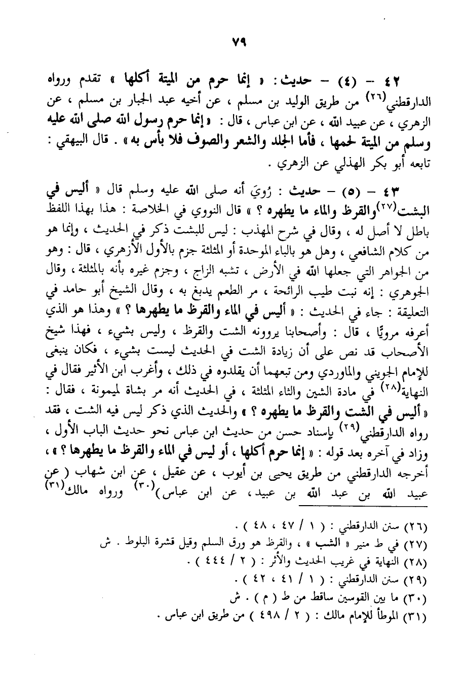 حَدِيثُ: «إنَّمَا حَرُمَ مِنْ الْمَيْتَةِ أَكْلُهَا» تَقَدَّمَ وَرَوَاهُ الدَّارَقُطْنِيُّ مِنْ طَرِيقِ الْوَلِيدِ بْنِ مُسْلِمٍ، عَنْ أَخِيهِ عَبْدِ الْجَبَّارِ بْنِ مُسْلِمٍ، عَنْ الزُّهْرِيِّ، عَنْ عُبَيْدِ اللَّهِ، عَنْ ابْنِ عَبَّاسٍ، قَالَ: «إنَّمَا حَرَّمَ رَسُولُ اللَّه - صَلَّى اللَّهُ عَلَيْهِ وَسَلَّمَ - مِنْ الْمَيْتَةِ لَحْمَهَا، فَأَمَّا الْجِلْدُ وَالشَّعَرُ وَالصُّوفُ فَلَا بَأْسَ بِهِ» . قَالَ الْبَيْهَقِيُّ: تَابَعَهُ أَبُو بَكْرٍ الْهُذَلِيُّ عَنْ الزُّهْرِيِّ. 43 - (5) - حَدِيثٌ: رُوِيَ أَنَّهُ - صَلَّى اللَّهُ عَلَيْهِ وَسَلَّمَ - قَالَ «أَلَيْسَ فِي الْبَشْتِ وَالْقَرَظِ وَالْمَاءِ مَا يُطَهِّرُهُ؟» قَالَ النَّوَوِيُّ فِي الْخُلَاصَةِ: هَذَا بِهَذَا اللَّفْظِ بَاطِلٌ لَا أَصْلَ لَهُ، وَقَالَ فِي شَرْحِ الْمُهَذَّبِ: لَيْسَ لِلْبَشْتِ ذِكْرٌ فِي الْحَدِيثِ وَإِنَّمَا هُوَ مِنْ كَلَامِ الشَّافِعِيِّ وَهَلْ هُوَ بِالْبَاءِ الْمُوَحَّدَةِ أَوْ الْمُثَلَّثَةِ جَزَمَ بِالْأَوَّلِ الْأَزْهَرِيُّ قَالَ وَهُوَ مِنْ الْجَوَاهِرِ الَّتِي جَعَلَهَا اللَّهُ فِي الْأَرْضِ تُشْبِهُ الزَّاجَ وَجَزَمَ غَيْرُهُ بِأَنَّهُ بِالْمُثَلَّثَةِ وَقَالَ الْجَوْهَرِيُّ إنَّهُ نَبْتٌ طَيِّبُ الرَّائِحَةِ مُرُّ الطَّعْمِ يُدْبَغُ بِهِ، وَقَالَ الشَّيْخُ أَبُو حَامِدٍ فِي التَّعْلِيقَةِ: جَاءَ فِي الْحَدِيثِ: «أَلَيْسَ فِي الْمَاءِ وَالْقَرَظِ مَا يُطَهِّرُهَا؟» .