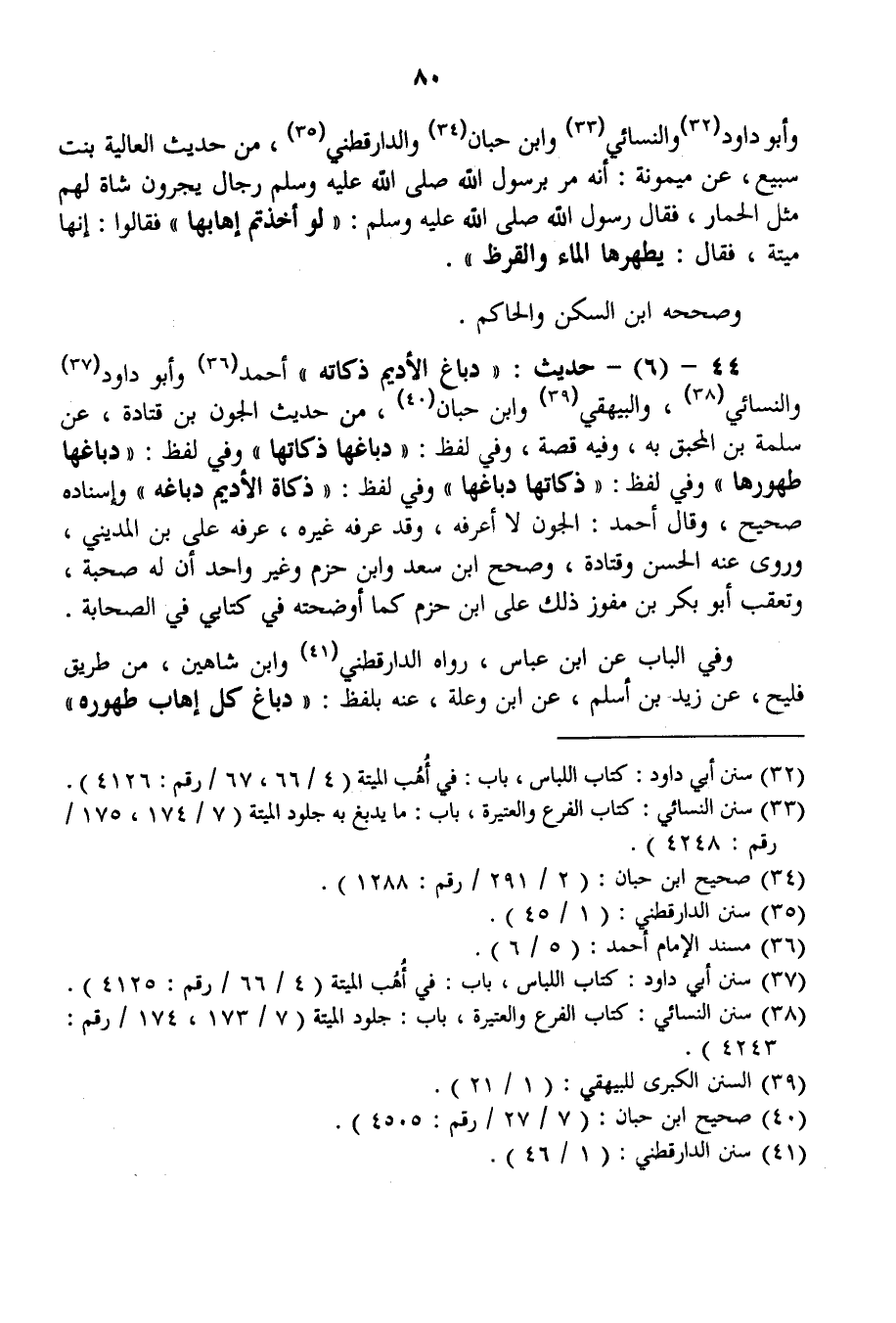 44 - (6) - حَدِيثُ: «دِبَاغُ الْأَدِيمِ ذَكَاتُهُ» أَحْمَدُ وَأَبُو دَاوُد وَالنَّسَائِيُّ، وَالْبَيْهَقِيُّ وَابْنُ حِبَّانَ، مِنْ حَدِيثِ الْجَوْنِ بْنِ قَتَادَةَ، عَنْ سَلَمَةَ بْنِ الْمُحَبِّقِ بِهِ، وَفِيهِ قِصَّةٌ، وَفِي لَفْظٍ: " دِبَاغُهَا ذَكَاتُهَا " وَفِي لَفْظٍ: " دِبَاغُهَا طَهُورُهَا " وَفِي لَفْظٍ: " ذَكَاتُهَا دِبَاغُهَا " وَفِي لَفْظٍ: " ذَكَاةُ الْأَدِيمِ دِبَاغُهُ " وَإِسْنَادُهُ صَحِيحٌ، وَقَالَ أَحْمَدُ: الْجَوْنُ لَا أَعْرِفُهُ، وَقَدْ عَرَفَهُ غَيْرُهُ، عَرَفَهُ عَلِيُّ بْنُ الْمَدِينِيِّ، وَرَوَى عَنْهُ الْحَسَنُ وَقَتَادَةُ، وَصَحَّحَ ابْنُ سَعْدِ وَابْنُ حَزْمٍ وَغَيْرُ وَاحِدٍ أَنَّ لَهُ صُحْبَةً، وَتَعَقَّبَ أَبُو بَكْرِ بْنُ مُفَوِّزٍ ذَلِكَ عَلَى بْنِ حَزْمٍ كَمَا أَوْضَحْتُهُ فِي كِتَابِي فِي الصَّحَابَةِ.