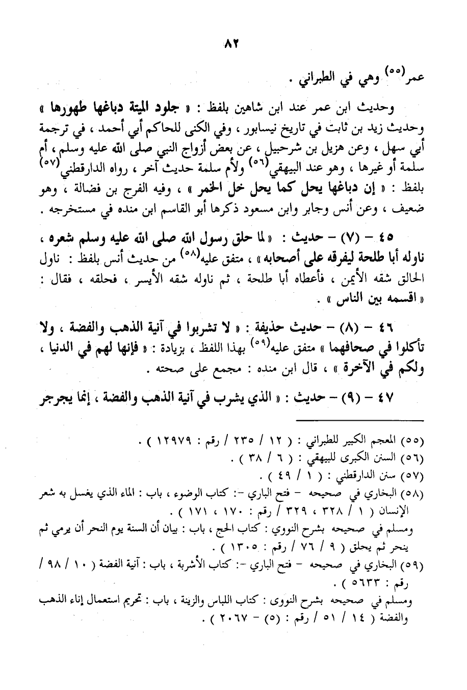 46 - (8) - حَدِيثُ حُذَيْفَةَ: «لَا تَشْرَبُوا فِي آنِيَةِ الذَّهَبِ وَالْفِضَّةِ، وَلَا تَأْكُلُوا فِي صِحَافِهِمَا» مُتَّفَقٌ عَلَيْهِ بِهَذَا اللَّفْظِ، بِزِيَادَةِ: " فَإِنَّهَا لَهُمْ فِي الدُّنْيَا، وَلَكُمْ فِي الْآخِرَةِ "، قَالَ ابْنُ مَنْدَهْ: مُجْمَعٌ عَلَى صِحَّتِهِ.