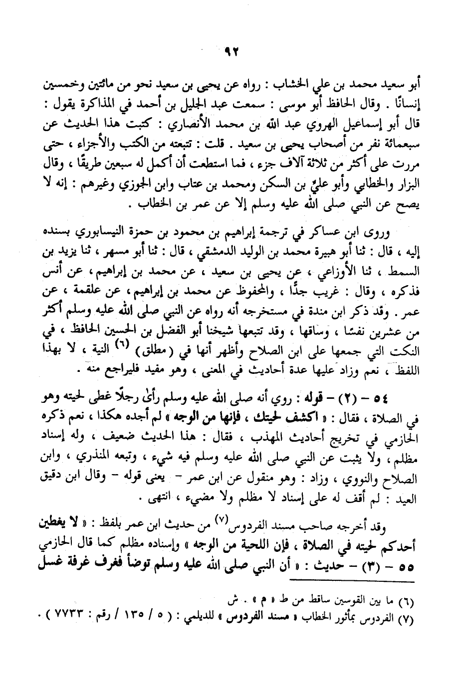 54 - (2) - قَوْلُهُ: رُوِيَ «أَنَّهُ - صَلَّى اللَّهُ عَلَيْهِ وَسَلَّمَ - رَأَى رَجُلًا غَطَّى لِحْيَتَهُ وَهُوَ فِي الصَّلَاةِ، فَقَالَ: اكْشِفْ لِحْيَتَكَ، فَإِنَّهَا مِنْ الْوَجْهِ» لَمْ أَجِدْهُ هَكَذَا، نَعَمْ ذَكَرَهُ الْحَازِمِيُّ فِي تَخْرِيجِ أَحَادِيثِ الْمُهَذَّبِ، فَقَالَ: هَذَا الْحَدِيثُ ضَعِيفٌ، وَلَهُ إسْنَادٌ مُظْلِمٌ، وَلَا يَثْبُتُ عَنْ النَّبِيِّ - صَلَّى اللَّهُ عَلَيْهِ وَسَلَّمَ - فِيهِ شَيْءٌ، وَتَبِعَهُ الْمُنْذِرِيُّ، وَابْنُ الصَّلَاحِ وَالنَّوَوِيُّ، وَزَادَ: وَهُوَ مَنْقُولٌ عَنْ ابْنِ عُمَرَ - يَعْنِي قَوْلَهُ - وَقَالَ ابْنُ دَقِيقِ الْعِيدِ: لَمْ أَقِفْ لَهُ عَلَى إسْنَادٍ لَا مُظْلِمٌ وَلَا مُضِيءٌ، انْتَهَى. وَقَدْ أَخَرَجَهُ صَاحِبُ مُسْنَدِ الْفِرْدَوْسِ مِنْ حَدِيثِ ابْنِ عُمَرَ بِلَفْظِ: «لَا يُغَطِّيَنَّ أَحَدُكُمْ لِحْيَتَهُ فِي الصَّلَاةِ، فَإِنَّ اللِّحْيَةَ مِنْ الْوَجْهِ» وَإِسْنَادُهُ مُظْلِمٌ كَمَا قَالَ الْحَازِمِيُّ.