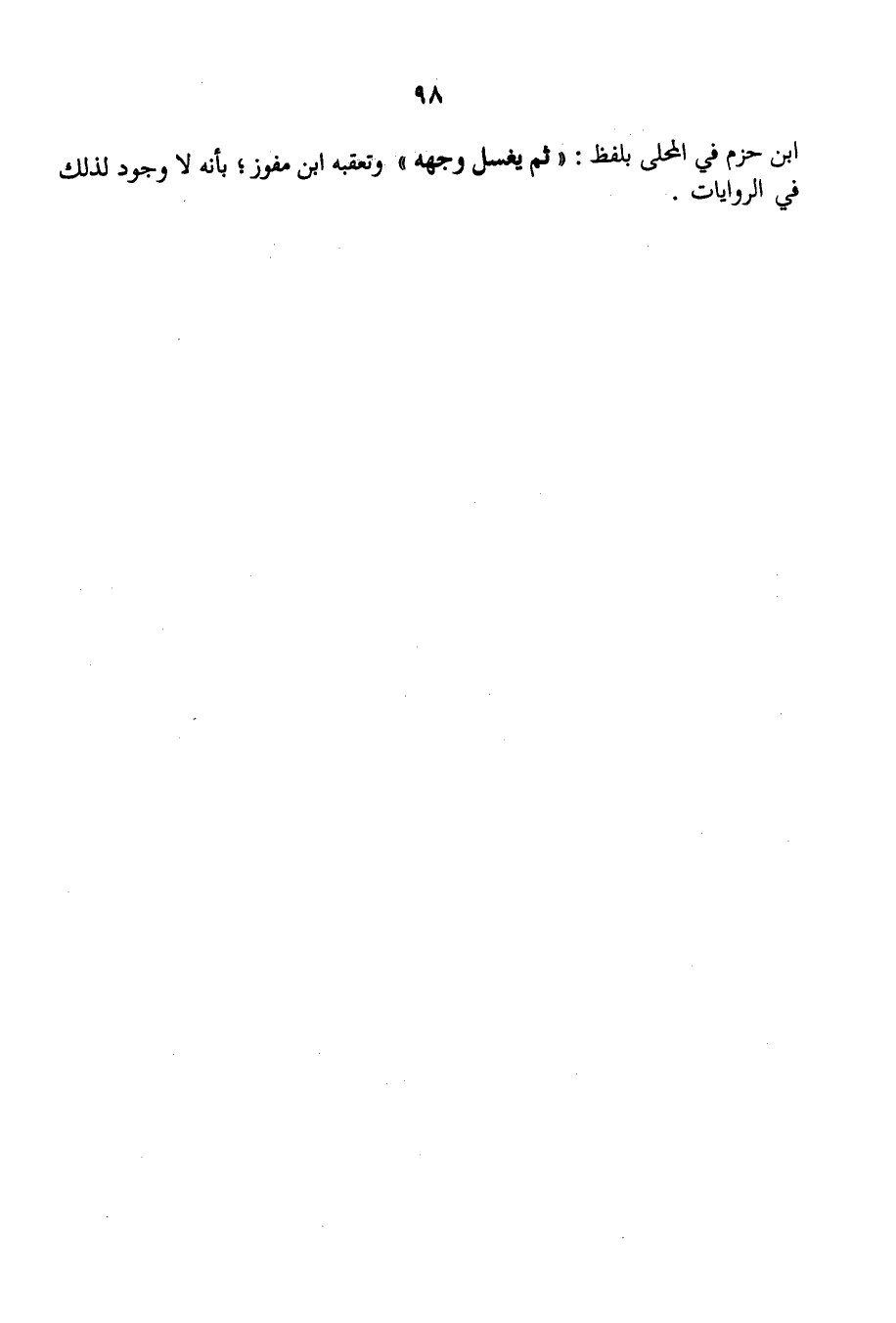 ابْنُ حَزْمٍ فِي الْمُحَلَّى بِلَفْظِ: " ثُمَّ يَغْسِلَ وَجْهَهُ " وَتَعَقَّبَهُ ابْنُ مُفَوِّزٍ؛ بِأَنَّهُ لَا وُجُودَ لِذَلِكَ فِي الرِّوَايَاتِ.