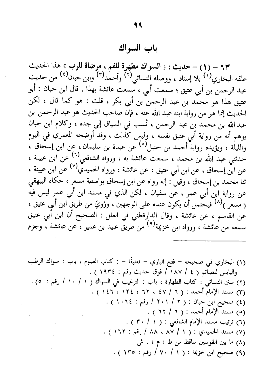 ِ 63 - (1) - حَدِيثُ «السِّوَاكُ مَطْهَرَةٌ لِلْفَمِ، مَرْضَاةٌ لِلرَّبِّ» هَذَا الْحَدِيثُ عَلَّقَهُ الْبُخَارِيُّ بِلَا إسْنَادٍ، وَوَصَلَهُ النَّسَائِيُّ وَأَحْمَدُ وَابْنُ حِبَّانَ مِنْ حَدِيثِ عَبْدِ الرَّحْمَنِ بْنِ أَبِي عَتِيقٍ؛ سَمِعْتُ أَبِي، سَمِعْتُ عَائِشَةَ بِهَذَا. قَالَ ابْنُ حِبَّانَ: أَبُو عَتِيقٍ هَذَا هُوَ مُحَمَّدُ بْنُ عَبْدِ الرَّحْمَنِ بْنِ أَبِي بَكْرٍ، قُلْتُ: هُوَ كَمَا قَالَ، لَكِنَّ الْحَدِيثَ إنَّمَا هُوَ مِنْ رِوَايَةِ ابْنِهِ عَبْدِ اللَّهِ عَنْهُ، فَإِنَّ صَاحِبَ الْحَدِيثِ هُوَ عَبْدُ الرَّحْمَنِ بْنُ عَبْدِ اللَّهِ بْنِ مُحَمَّدِ بْنِ عَبْدِ الرَّحْمَنِ، نُسِبَ فِي السِّيَاقِ إلَى جَدِّهِ، وَكَلَامُ ابْنِ حِبَّانَ يُوهِمُ أَنَّهُ مِنْ رِوَايَةِ أَبِي عَتِيقٍ نَفْسِهِ، وَلَيْسَ كَذَلِكَ، وَقَدْ أَوْضَحَهُ الْمَعْمَرِيُّ فِي الْيَوْمِ وَاللَّيْلَةِ، وَيُؤَيِّدُهُ رِوَايَةُ أَحْمَدَ بْنِ حَنْبَلٍ عَنْ عَبْدَةَ بْنِ سُلَيْمَانَ، عَنْ ابْن إِسْحَاقَ، حَدَّثَنِي عَبْدُ اللَّهِ بْنُ مُحَمَّدٍ، سَمِعَتْ عَائِشَةُ بِهِ، وَرَوَاهُ الشَّافِعِيُّ عَنْ ابْنِ عُيَيْنَةَ، عَنْ ابْنِ إِسْحَاقَ، عَنْ ابْنِ أَبِي عَتِيقٍ، عَنْ عَائِشَةَ، وَرَوَاهُ الْحُمَيْدِيُّ عَنْ ابْنِ عُيَيْنَةَ، ثَنَا مُحَمَّدُ بْنُ إِسْحَاقَ، وَقِيلَ: إنَّهُ رَوَاهُ عَنْ ابْنِ إِسْحَاقَ بِوَاسِطَةِ مِسْعَرٍ، حَكَاهُ الْبَيْهَقِيّ عَنْ رِوَايَةِ ابْنِ أَبِي عُمَرَ، عَنْ سُفْيَانَ، لَكِنَّ الَّذِي فِي مُسْنَدِ ابْنِ أَبِي عُمَرَ لَيْسَ فِيهِ (مِسْعَرٌ) فَيَحْتَمِلُ أَنْ يَكُونَ عِنْدَهُ عَلَى الْوَجْهَيْنِ، وَرُوِيَ مِنْ طَرِيقِ ابْنِ أَبِي عَتِيقٍ، عَنْ الْقَاسِمِ، عَنْ عَائِشَةَ، وَقَالَ الدَّارَقُطْنِيُّ فِي الْعِلَلِ: الصَّحِيحُ أَنَّ ابْنَ أَبِي عَتِيقٍ سَمِعَهُ مِنْ عَائِشَةَ، وَرَوَاهُ ابْنُ خُزَيْمَةَ مِنْ طَرِيقِ عُبَيْدِ بْنِ عُمَيْرِ، عَنْ عَائِشَةَ، وَجَزَمَ