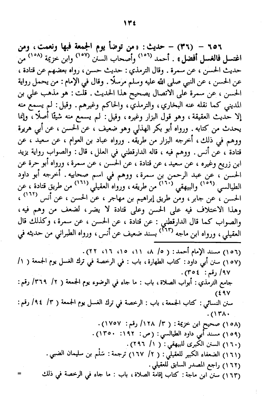 حَدِيثُ: «مَنْ تَوَضَّأَ يَوْمَ الْجُمُعَةِ فَبِهَا وَنِعْمَتْ، وَمَنْ اغْتَسَلَ فَالْغُسْلُ أَفْضَلُ» . أَحْمَدُ وَأَصْحَابُ السُّنَنِ وَابْنُ خُزَيْمَةَ مِنْ حَدِيثِ الْحَسَنِ، عَنْ سَمُرَةَ. وَقَالَ التِّرْمِذِيُّ: حَدِيثٌ حَسَنٌ، رَوَاهُ بَعْضُهُمْ عَنْ قَتَادَةَ، عَنْ الْحَسَنِ، عَنْ النَّبِيِّ - صَلَّى اللَّهُ عَلَيْهِ وَسَلَّمَ - مُرْسَلًا. وَقَالَ فِي الْإِمَامِ: مَنْ يَحْمِلُ رِوَايَةَ الْحَسَنِ، عَنْ سَمُرَةَ عَلَى الِاتِّصَالِ يُصَحِّحُ هَذَا الْحَدِيثَ.