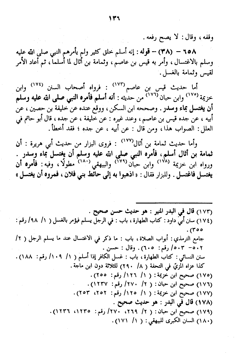 أَمَّا حَدِيثُ قَيْسِ بْنِ عَاصِمٍ: فَرَوَاهُ أَصْحَابُ السُّنَنِ وَابْنُ خُزَيْمَةَ وَابْنُ حِبَّانَ مِنْ حَدِيثِهِ: «أَنَّهُ أَسْلَمَ فَأَمَرَهُ النَّبِيُّ - صَلَّى اللَّهُ عَلَيْهِ وَسَلَّمَ - أَنْ يَغْتَسِلَ بِمَاءٍ وَسِدْرٍ» . وَصَحَّحَهُ ابْنُ السَّكَنِ، وَوَقَعَ عِنْدَهُ عَنْ خَلِيفَةَ بْنِ حُصَيْنٍ، عَنْ أَبِيهِ، عَنْ جَدِّهِ قَيْسِ بْنِ عَاصِمٍ، وَعِنْدَ غَيْرِهِ: عَنْ خَلِيفَةَ، عَنْ جَدِّهِ، قَالَ أَبُو حَاتِمٍ فِي الْعِلَلِ: الصَّوَابُ هَذَا، وَمَنْ قَالَ: عَنْ أَبِيهِ، عَنْ جَدِّهِ؛ فَقَدْ أَخْطَأَ. وَأَمَّا حَدِيثُ ثُمَامَةَ بْنِ أَثَالٍ: فَرَوَى الْبَزَّارُ مِنْ حَدِيثِ أَبِي هُرَيْرَةَ: «أَنَّ ثُمَامَةَ بْنَ أَثَالٍ أَسْلَمَ، فَأَمَرَهُ النَّبِيُّ - صَلَّى اللَّهُ عَلَيْهِ وَسَلَّمَ - أَنْ يَغْتَسِلَ بِمَاءٍ وَسِدْرٍ» .
