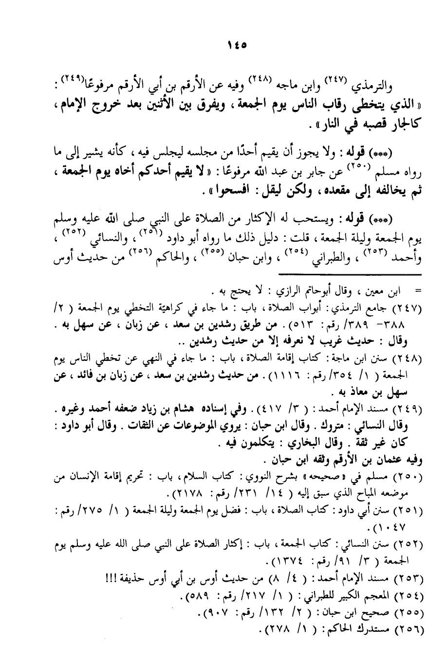 وَالتِّرْمِذِيُّ وَابْنُ مَاجَهْ وَفِيهِ عَنْ الْأَرْقَمِ بْنِ أَبِي الْأَرْقَمِ مَرْفُوعًا: «الَّذِي يَتَخَطَّى رِقَابَ النَّاسِ يَوْمَ الْجُمُعَةِ، وَيُفَرِّقُ بَيْنَ الِاثْنَيْنِ بَعْدَ خُرُوجِ الْإِمَامِ، كَالْجَارِّ قُصْبَهُ فِي النَّارِ» .