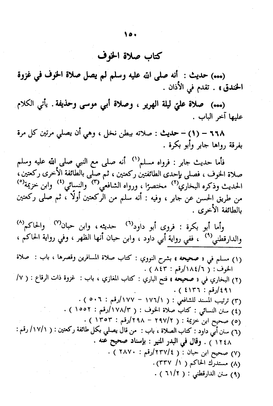 668 - (1) - حَدِيثُ: صَلَاتُهُ بِبَطْنِ نَخْلٍ، وَهِيَ أَنْ يُصَلِّيَ مَرَّتَيْنِ كُلَّ مَرَّةٍ بِفِرْقَةٍ رَوَاهَا جَابِرٌ وَأَبُو بَكْرَةَ. فَأَمَّا حَدِيثُ جَابِرٍ: فَرَوَاهُ مُسْلِمٌ «أَنَّهُ صَلَّى مَعَ النَّبِيِّ - صَلَّى اللَّهُ عَلَيْهِ وَسَلَّمَ - صَلَاةَ الْخَوْفِ، فَصَلَّى بِإِحْدَى الطَّائِفَتَيْنِ رَكْعَتَيْنِ، ثُمَّ صَلَّى بِالطَّائِفَةِ الْأُخْرَى رَكْعَتَيْنِ» ، الْحَدِيثَ وَذَكَرَهُ الْبُخَارِيُّ مُخْتَصَرًا، وَرَوَاهُ الشَّافِعِيُّ وَالنَّسَائِيُّ وَابْنُ خُزَيْمَةَ مِنْ طَرِيقِ الْحَسَنِ عَنْ جَابِرٍ، وَفِيهِ: «أَنَّهُ سَلَّمَ مِنْ الرَّكْعَتَيْنِ أَوَّلًا، ثُمَّ صَلَّى رَكْعَتَيْنِ بِالطَّائِفَةِ الْأُخْرَى» . وَأَمَّا أَبُو بَكْرَةَ: فَرَوَى أَبُو دَاوُد حَدِيثَهُ، وَابْنُ حِبَّانَ وَالْحَاكِمُ وَالدَّارَقُطْنِيّ، فَفِي رِوَايَةِ أَبِي دَاوُد، وَابْنِ حِبَّانَ أَنَّهَا الظُّهْرُ، وَفِي رِوَايَةِ الْحَاكِمِ،