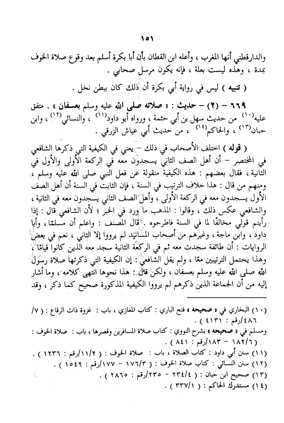 669 - (2) - حَدِيثُ: «صَلَاتُهُ - صَلَّى اللَّهُ عَلَيْهِ وَسَلَّمَ - بِعُسْفَانَ» . مُتَّفَقٌ عَلَيْهِ مِنْ حَدِيثِ سَهْلِ بْنِ أَبِي حَثْمَةَ، وَرَوَاهُ أَبُو دَاوُد، وَالنَّسَائِيُّ، وَابْنُ حِبَّانَ، وَالْحَاكِمُ، مِنْ حَدِيثِ أَبِي عَيَّاشٍ الزُّرَقِيِّ.