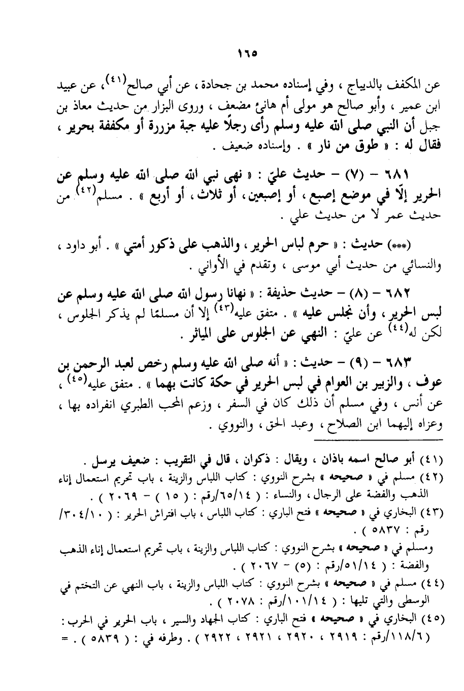682 - (8) - حَدِيثُ حُذَيْفَةَ: «نَهَانَا رَسُولُ اللَّهِ - صَلَّى اللَّهُ عَلَيْهِ وَسَلَّمَ - عَنْ لُبْسِ الْحَرِيرِ، وَأَنْ نَجْلِسَ عَلَيْهِ» . مُتَّفَقٌ عَلَيْهِ إلَّا أَنَّ مُسْلِمًا لَمْ يَذْكُرْ الْجُلُوسَ، لَكِنْ لَهُ عَنْ عَلِيٍّ: النَّهْيُ عَنْ الْجُلُوسِ عَلَى الْمَيَاثِرِ.