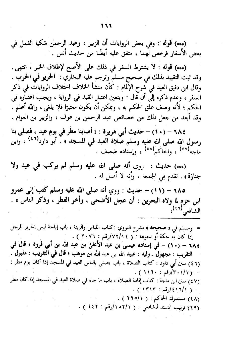 وَقَدْ ثَبَتَ التَّقْيِيدُ بِذَلِكَ فِي صَحِيحِ مُسْلِمٍ وَتَرْجَمَ عَلَيْهِ الْبُخَارِيُّ: الْحَرِيرُ فِي الْحَرْبِ. وَقَالَ ابْنُ دَقِيقٍ الْعِيدُ فِي شَرْحِ الْإِلْمَامِ: كَأَنَّ مُنْشَأَ الْخِلَافِ اخْتِلَافُ الرِّوَايَاتِ فِي ذِكْرِ السَّفَرِ، وَعَدَمِ ذِكْرِهِ إلَى أَنْ قَالَ: وَيَتَعَيَّنُ اعْتِبَارُ الْقَيْدِ فِي الرِّوَايَةِ، وَيَجِبُ اعْتِبَارُهُ فِي الْحُكْمِ؛ لِأَنَّهُ وَصْفٌ عُلِّقَ الْحُكْمُ بِهِ، وَيُمْكِنُ أَنْ يَكُونَ مُعْتَبَرًا فَلَا يُلْغَى، وَاَللَّهُ أَعْلَمُ. وَقَدْ أَبْعَدَ مَنْ جَعَلَ ذَلِكَ مِنْ خَصَائِصِ عَبْدِ الرَّحْمَنِ بْنِ عَوْفٍ، وَالزُّبَيْرِ بْنِ الْعَوَّامِ.