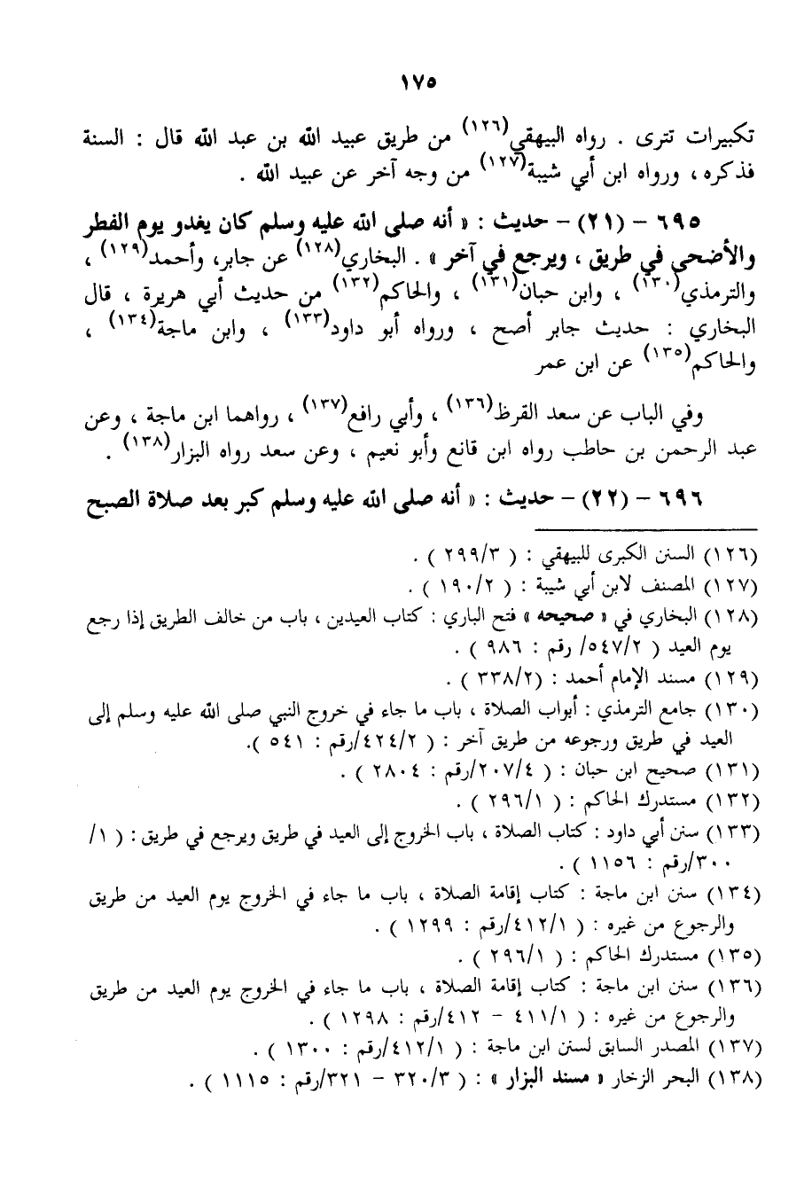 695 - (21) - حَدِيثُ: " «أَنَّهُ - صَلَّى اللَّهُ عَلَيْهِ وَسَلَّمَ - كَانَ يَغْدُو يَوْمَ الْفِطْرِ وَالْأَضْحَى فِي طَرِيقٍ، وَيَرْجِعُ فِي آخَرَ» . الْبُخَارِيُّ عَنْ جَابِرٍ، وَأَحْمَدُ، وَالتِّرْمِذِيُّ، وَابْنُ حِبَّانَ، وَالْحَاكِمُ مِنْ حَدِيثِ أَبِي هُرَيْرَةَ، قَالَ الْبُخَارِيُّ: حَدِيثُ جَابِرٍ أَصَحُّ، وَرَوَاهُ أَبُو دَاوُد، وَابْنُ مَاجَهْ، وَالْحَاكِمُ عَنْ ابْنِ عُمَرَ وَفِي الْبَابِ عَنْ سَعْدِ الْقَرَظِ، وَأَبِي رَافِعٍ، رَوَاهُمَا ابْنُ مَاجَهْ، وَعَنْ عَبْدِ الرَّحْمَنِ بْنِ حَاطِبٍ رَوَاهُ ابْنُ قَانِعٍ وَأَبُو نُعَيْمٍ، وَعَنْ سَعْدٍ رَوَاهُ الْبَزَّارُ