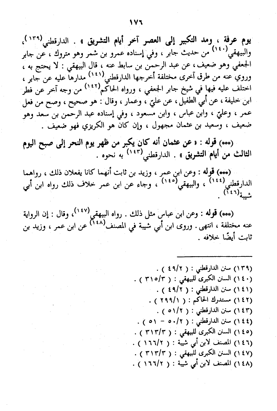 يَوْمَ عَرَفَةَ، وَمَدَّ التَّكْبِيرَ إلَى الْعَصْرِ آخِرَ أَيَّامِ التَّشْرِيقِ» . الدَّارَقُطْنِيُّ، وَالْبَيْهَقِيُّ مِنْ حَدِيثِ جَابِرٍ، وَفِي إسْنَادِهِ عَمْرُو بْنُ شِمْرٍ وَهُوَ مَتْرُوكٌ، عَنْ جَابِرٍ الْجُعْفِيِّ وَهُوَ ضَعِيفٌ، عَنْ عَبْدِ الرَّحْمَنِ بْنِ سَابِطٍ عَنْهُ، قَالَ الْبَيْهَقِيُّ: لَا يُحْتَجُّ بِهِ، وَرُوِيَ عَنْهُ مِنْ طُرُقٍ أُخْرَى مُخْتَلِفَةٍ أَخْرَجَهَا الدَّارَقُطْنِيُّ مَدَارُهَا عَلَيْهِ عَنْ جَابِرٍ، اخْتَلَفَ عَلَيْهِ فِيهَا فِي شَيْخِ جَابِرٍ الْجُعْفِيِّ، وَرَوَاهُ الْحَاكِمُ مِنْ وَجْهٍ آخَرَ عَنْ فِطْرِ بْنِ خَلِيفَةَ، عَنْ أَبِي الطُّفَيْلِ، عَنْ عَلِيٍّ، وَعَمَّارٍ، وَقَالَ: هُوَ صَحِيحٌ، وَصَحَّ مِنْ فِعْلِ عُمَرَ، وَعَلِيٍّ، وَابْنِ عَبَّاسٍ، وَابْنِ مَسْعُودٍ، وَفِي إسْنَادِهِ عَبْدُ الرَّحْمَنِ بْنُ سَعْدٍ وَهُوَ ضَعِيفٌ، وَسَعِيدُ بْنُ عُثْمَانَ مَجْهُولٌ، وَإِنْ كَانَ هُوَ الْكُرَيْزِيُّ فَهُوَ ضَعِيفٌ.
