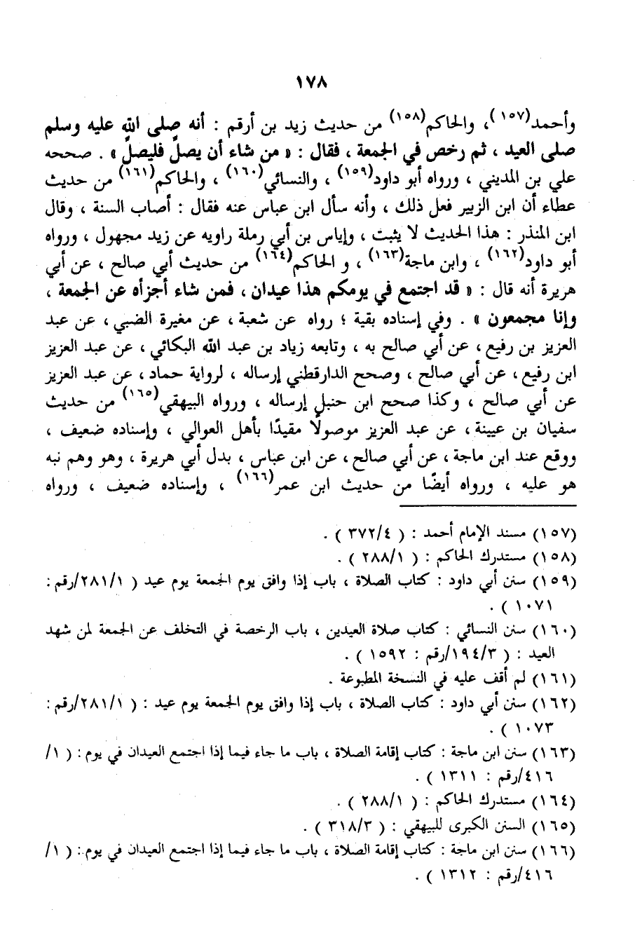 وَأَحْمَدُ، وَالْحَاكِمُ مِنْ حَدِيثِ زَيْدِ بْنِ أَرْقَمَ: «أَنَّهُ - صَلَّى اللَّهُ عَلَيْهِ وَسَلَّمَ - صَلَّى الْعِيدَ، ثُمَّ رَخَّصَ فِي الْجُمُعَةِ، فَقَالَ: مَنْ شَاءَ أَنْ يُصَلِّيَ فَلْيُصَلِّ» . صَحَّحَهُ عَلِيُّ بْنُ الْمَدِينِيِّ، وَرَوَاهُ أَبُو دَاوُد، وَالنَّسَائِيُّ، وَالْحَاكِمُ مِنْ حَدِيثِ عَطَاءٍ أَنَّ ابْنَ الزُّبَيْرِ فَعَلَ ذَلِكَ، وَأَنَّهُ سَأَلَ ابْنَ عَبَّاسٍ عَنْهُ فَقَالَ: أَصَابَ السُّنَّةَ، وَقَالَ ابْنُ الْمُنْذِرِ: هَذَا الْحَدِيثُ لَا يَثْبُتُ، وَإِيَاسُ بْنُ أَبِي رَمَلَةَ رَاوِيهِ عَنْ زَيْدٍ مَجْهُولٌ، وَرَوَاهُ أَبُو دَاوُد، وَابْنُ مَاجَهْ، وَالْحَاكِمُ مِنْ حَدِيثِ أَبِي صَالِحٍ، عَنْ أَبِي هُرَيْرَةَ أَنَّهُ قَالَ: «قَدْ اجْتَمَعَ فِي يَوْمِكُمْ هَذَا عِيدَانِ، فَمَنْ شَاءَ أَجْزَأَهُ عَنْ الْجُمُعَةِ، وَإِنَّا مُجْمِعُونَ» وَفِي إسْنَادِهِ بَقِيَّةُ رَوَاهُ عَنْ شُعْبَةَ، عَنْ مُغِيرَةَ الضَّبِّيِّ، عَنْ عَبْدِ الْعَزِيزِ بْنِ رُفَيْعٍ، عَنْ أَبِي صَالِحٍ بِهِ، وَتَابَعَهُ زِيَادُ بْنُ عَبْدِ اللَّهِ الْبُكَائِيُّ، عَنْ عَبْدِ الْعَزِيزِ بْنِ رُفَيْعٍ، عَنْ أَبِي صَالِحٍ، وَصَحَّحَ الدَّارَقُطْنِيُّ إرْسَالَهُ، لِرِوَايَةِ حَمَّادٍ، عَنْ عَبْدِ الْعَزِيزِ عَنْ أَبِي صَالِحٍ، وَكَذَا صَحَّحَ ابْنُ حَنْبَلٍ إرْسَالَهُ، وَرَوَاهُ الْبَيْهَقِيُّ مِنْ حَدِيثِ سُفْيَانَ بْنِ عُيَيْنَةَ، عَنْ عَبْدِ الْعَزِيزِ مَوْصُولًا مُقَيَّدًا بِأَهْلِ الْعَوَالِي، وَإِسْنَادُهُ ضَعِيفٌ، وَوَقَعَ عِنْدَ ابْنِ مَاجَهْ، عَنْ أَبِي صَالِحٍ، عَنْ ابْنِ عَبَّاسٍ، بَدَلَ أَبِي هُرَيْرَةَ، وَهُوَ وَهْمٌ نَبَّهَ هُوَ عَلَيْهِ، وَرَوَاهُ أَيْضًا مِنْ حَدِيثِ ابْنِ عُمَرَ إسْنَادُهُ ضَعِيفٌ، وَرَوَاهُ