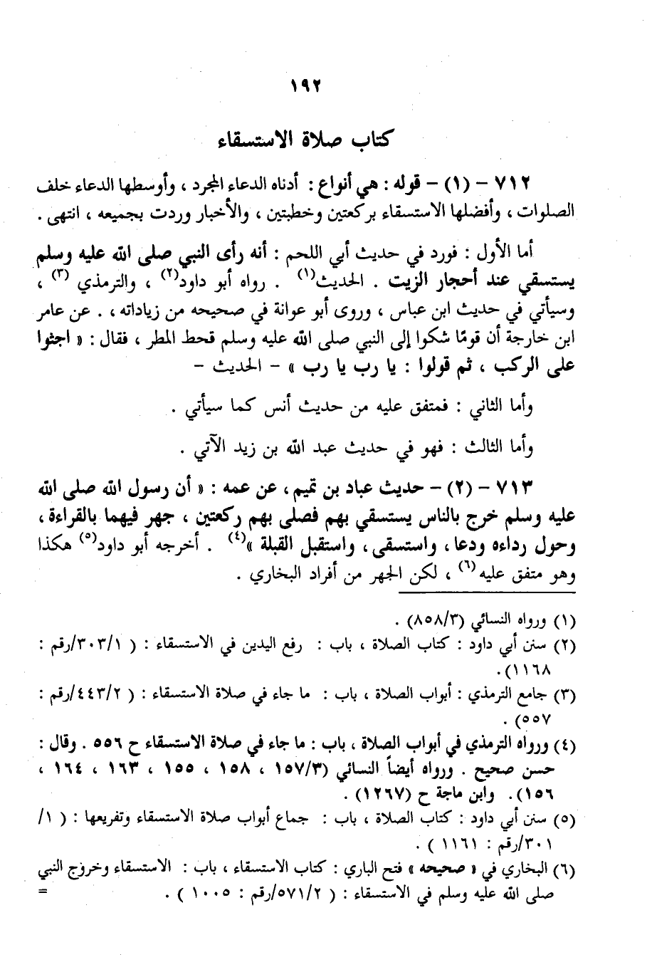713 - (2) - حَدِيثُ عَبَّادِ بْنِ تَمِيمٍ، عَنْ عَمِّهِ: «أَنَّ رَسُولَ اللَّهِ - صَلَّى اللَّهُ عَلَيْهِ وَسَلَّمَ - خَرَجَ بِالنَّاسِ يَسْتَسْقِي بِهِمْ فَصَلَّى بِهِمْ رَكْعَتَيْنِ، جَهَرَ فِيهِمَا بِالْقِرَاءَةِ، وَحَوَّلَ رِدَاءَهُ وَدَعَا، وَاسْتَسْقَى، وَاسْتَقْبَلَ الْقِبْلَةَ» . أَخْرَجَهُ أَبُو دَاوُد هَكَذَا وَهُوَ مُتَّفَقٌ عَلَيْهِ، لَكِنَّ الْجَهْرَ مِنْ أَفْرَادِ الْبُخَارِيِّ.
