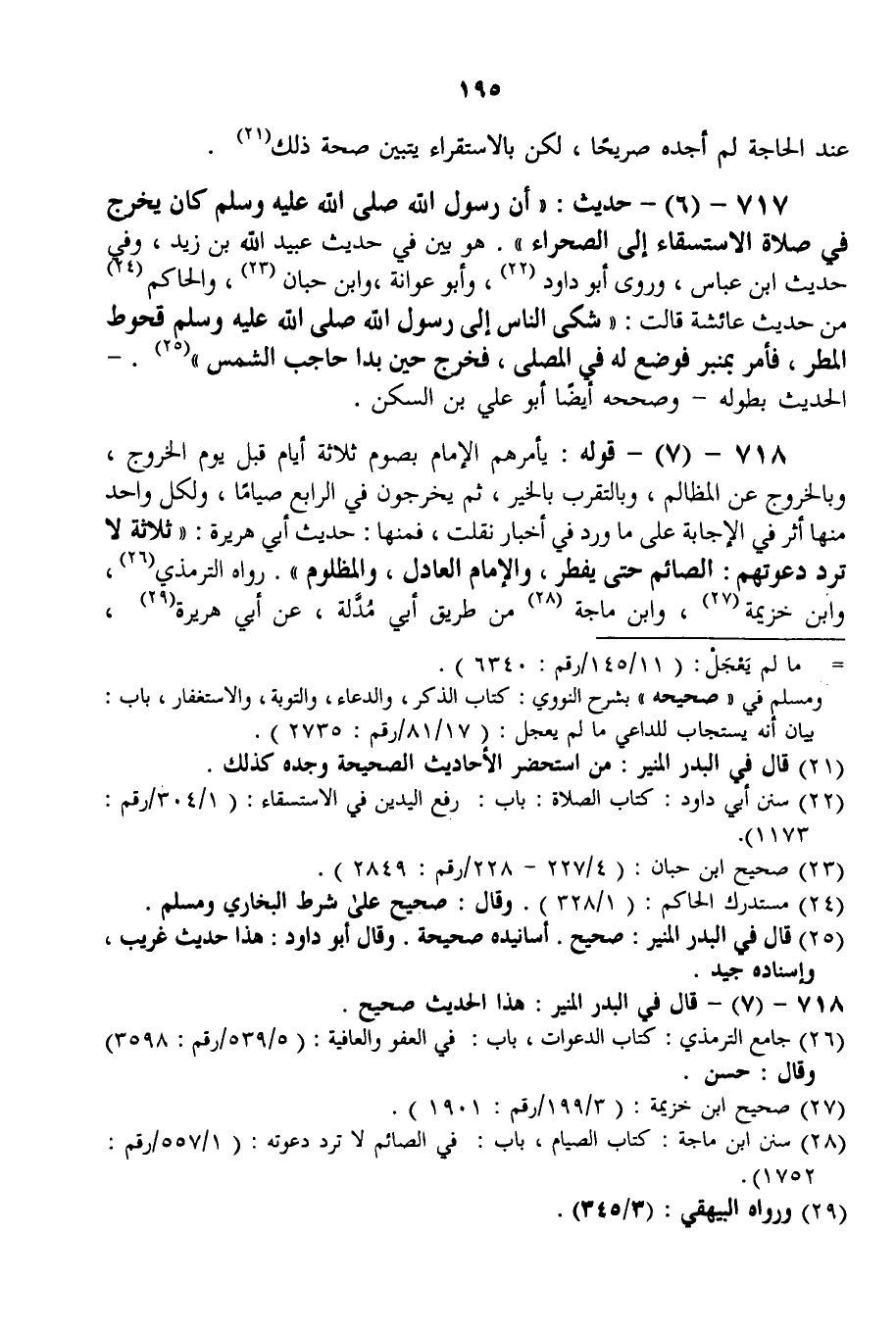 718 - (7) - قَوْلُهُ: يَأْمُرُهُمْ الْإِمَامُ بِصَوْمِ ثَلَاثَةِ أَيَّامٍ قَبْلَ يَوْمِ الْخُرُوجِ، وَبِالْخُرُوجِ عَنْ الْمَظَالِمِ، وَبِالتَّقَرُّبِ بِالْخَيْرِ، ثُمَّ يَخْرُجُونَ فِي الرَّابِعِ صِيَامًا، وَلِكُلِّ وَاحِدٍ مِنْهَا أَثَرٌ فِي الْإِجَابَةِ عَلَى مَا وَرَدَ فِي أَخْبَارٍ نُقِلَتْ، فَمِنْهَا: حَدِيثُ أَبِي هُرَيْرَةَ: «ثَلَاثَةٌ لَا تُرَدُّ دَعْوَتُهُمْ: الصَّائِمُ حَتَّى يُفْطِرَ، وَالْإِمَامُ الْعَادِلُ، وَالْمَظْلُومُ» . رَوَاهُ التِّرْمِذِيُّ، وَابْنُ خُزَيْمَةَ، وَابْنُ مَاجَهْ مِنْ طَرِيقِ أَبِي مُدِلَّةَ، عَنْ أَبِي هُرَيْرَةَ،
