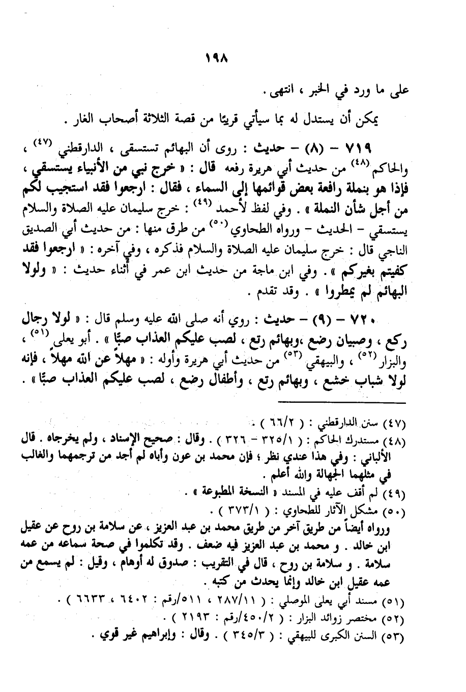 719 - (8) - حَدِيثٌ: رُوِيَ أَنَّ الْبَهَائِمَ تَسْتَسْقِي، الدَّارَقُطْنِيُّ، وَالْحَاكِمُ مِنْ حَدِيثِ أَبِي هُرَيْرَةَ رَفَعَهُ قَالَ: «خَرَجَ نَبِيٌّ مِنْ الْأَنْبِيَاءِ يَسْتَسْقِي، فَإِذَا هُوَ بِنَمْلَةٍ رَافِعَةٍ بَعْضَ قَوَائِمَهَا إلَى السَّمَاءِ، فَقَالَ: ارْجِعُوا فَقَدْ اُسْتُجِيبَ لَكُمْ مِنْ أَجْلِ شَأْنِ النَّمْلَةِ» . وَفِي لَفْظٍ لِأَحْمَدَ: خَرَجَ سُلَيْمَانُ - عَلَيْهِ الصَّلَاةُ وَالسَّلَامُ - يَسْتَسْقِي - الْحَدِيثَ - وَرَوَاهُ الطَّحَاوِيُّ مِنْ طُرُقٍ مِنْهَا: مِنْ حَدِيثِ أَبِي الصِّدِّيقِ النَّاجِي قَالَ: خَرَجَ سُلَيْمَانُ - عَلَيْهِ الصَّلَاةُ وَالسَّلَامُ - فَذَكَرَهُ، وَفِي آخِرِهِ: «ارْجِعُوا فَقَدْ كُفِيتُمْ بِغَيْرِكُمْ» . وَفِي ابْنِ مَاجَهْ مِنْ حَدِيثِ ابْنِ عُمَرَ فِي أَثْنَاءِ حَدِيثِ: «وَلَوْلَا الْبَهَائِمُ لَمْ يُمْطَرُوا» . وَقَدْ تَقَدَّمَ.