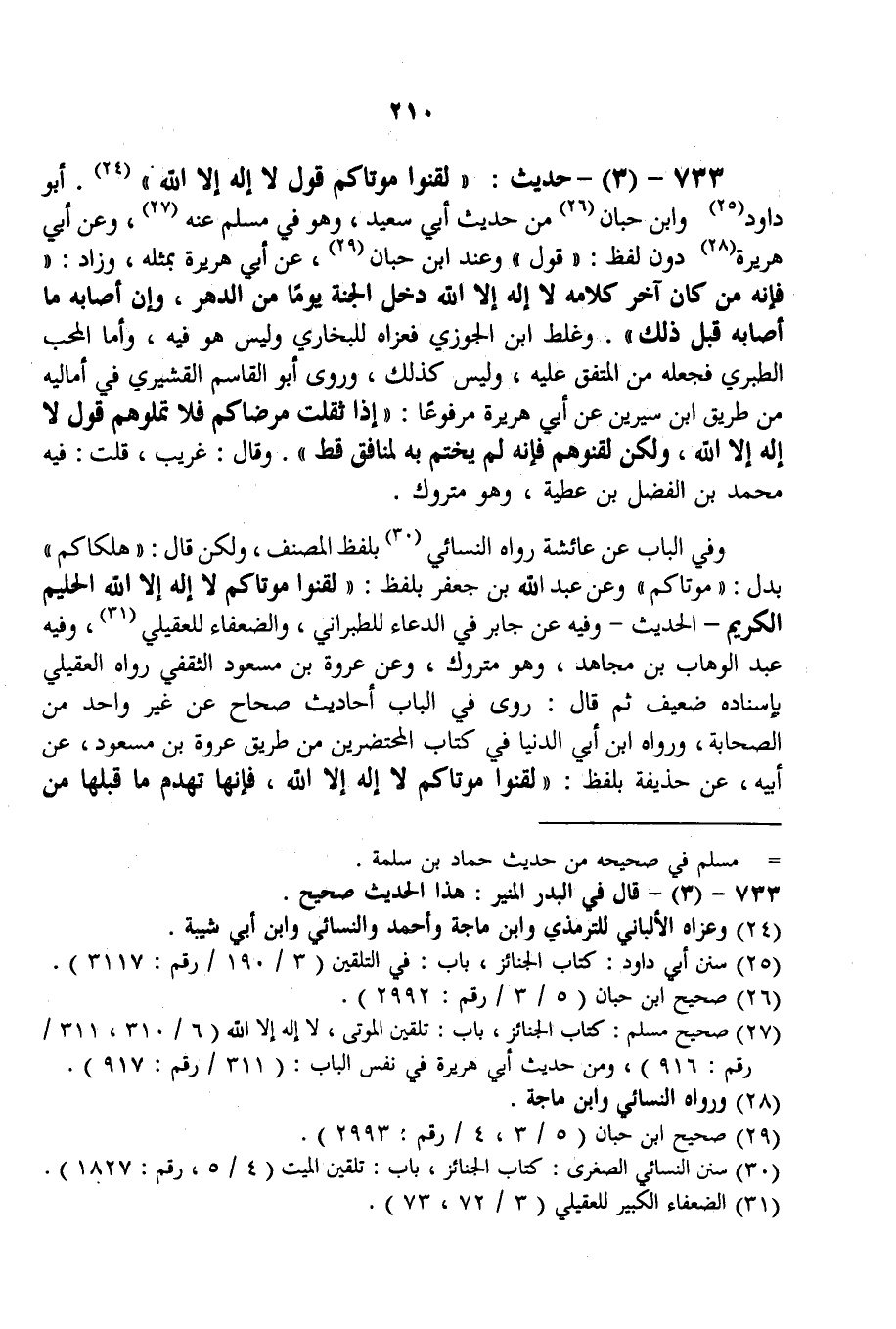 حَدِيثٌ: «لَقِّنُوا مَوْتَاكُمْ قَوْلَ لَا إلَهَ إلَّا اللَّهُ» . أَبُو دَاوُد وَابْنُ حِبَّانَ مِنْ حَدِيثِ أَبِي سَعِيدٍ، وَهُوَ فِي مُسْلِمٍ عَنْهُ، وَعَنْ أَبِي هُرَيْرَةَ دُونَ لَفْظِ: " قَوْلَ " وَعِنْدَ ابْنِ حِبَّانَ، عَنْ أَبِي هُرَيْرَةَ بِمِثْلِهِ، وَزَادَ: «فَإِنَّهُ مَنْ كَانَ آخِرُ كَلَامِهِ لَا إلَهَ إلَّا اللَّهُ دَخَلَ الْجَنَّةَ يَوْمًا مِنْ الدَّهْرِ، وَإِنْ أَصَابَهُ مَا أَصَابَهُ قَبْلَ ذَلِكَ» . وَغَلِطَ ابْنُ الْجَوْزِيِّ فَعَزَاهُ لِلْبُخَارِيِّ وَلَيْسَ هُوَ فِيهِ، وَأَمَّا الْمُحِبُّ الطَّبَرِيُّ فَجَعَلَهُ مِنْ الْمُتَّفَقِ عَلَيْهِ، وَلَيْسَ كَذَلِكَ.