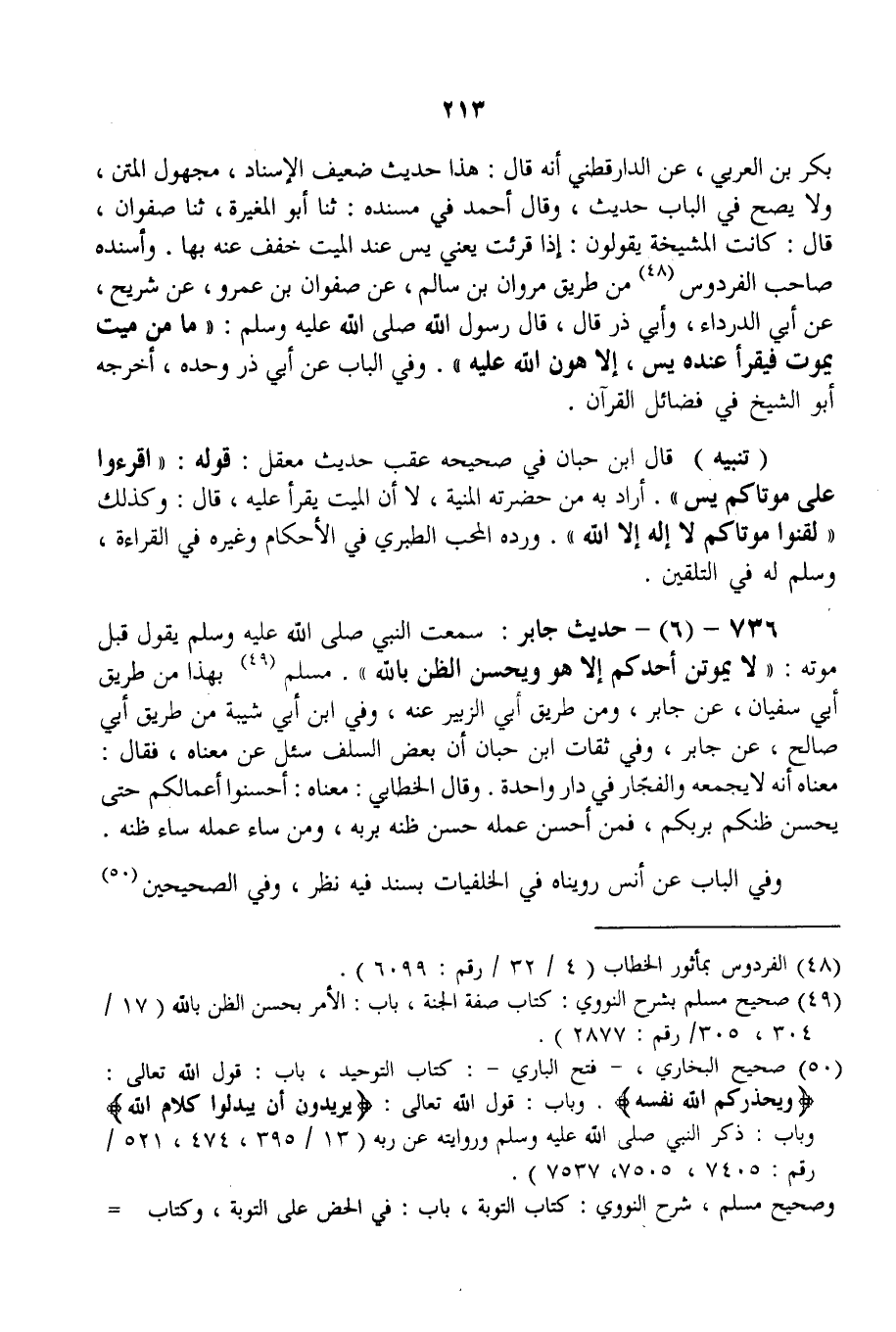 736 - (6) - حَدِيثُ جَابِرٍ: «سَمِعْت النَّبِيَّ - صَلَّى اللَّهُ عَلَيْهِ وَسَلَّمَ - يَقُولُ قَبْلَ مَوْتِهِ: لَا يَمُوتَنَّ أَحَدُكُمْ إلَّا وَهُوَ يُحْسِنُ الظَّنَّ بِاَللَّهِ» . مُسْلِمٌ بِهَذَا مِنْ طَرِيقِ أَبِي سُفْيَانَ، عَنْ جَابِرٍ، وَمِنْ طَرِيقِ أَبِي الزُّبَيْرِ عَنْهُ، وَفِي ابْنِ أَبِي شَيْبَةَ مِنْ طَرِيقِ أَبِي صَالِحٍ، عَنْ جَابِرٍ، وَفِي ثِقَاتِ ابْنِ حِبَّانَ أَنَّ بَعْضَ السَّلَفِ سُئِلَ عَنْ مَعْنَاهُ، فَقَالَ: مَعْنَاهُ أَنَّهُ لَا يَجْمَعُهُ وَالْفُجَّارَ فِي دَارٍ وَاحِدَةٍ. وَقَالَ الْخَطَّابِيُّ: مَعْنَاهُ: أَحْسِنُوا أَعْمَالَكُمْ حَتَّى يَحْسُنَ ظَنُّكُمْ بِرَبِّكُمْ، فَمَنْ أَحْسَنَ عَمَلَهُ حَسُنَ ظَنُّهُ بِرَبِّهِ، وَمَنْ سَاءَ عَمَلُهُ سَاءَ ظَنُّهُ. وَفِي الْبَابِ عَنْ أَنَسٍ رَوَيْنَاهُ فِي الْخَلْفِيَّاتِ بِسَنَدٍ فِيهِ نَظَرٌ.