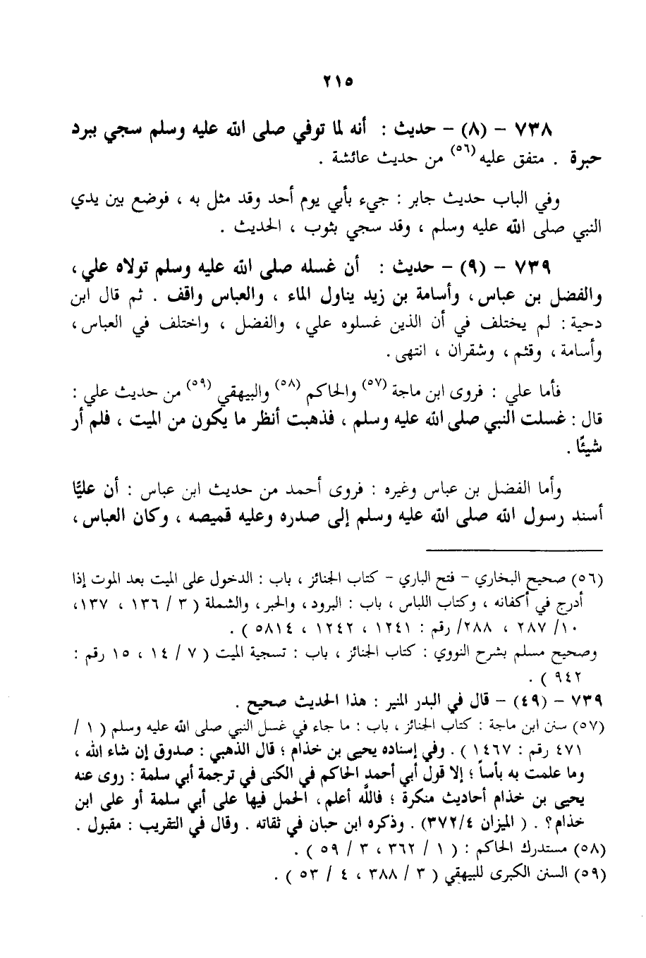739 - (9) - حَدِيثٌ: «أَنَّ غُسْلَهُ - صَلَّى اللَّهُ عَلَيْهِ وَسَلَّمَ - تَوَلَّاهُ عَلِيٌّ، وَالْفَضْلُ بْنُ عَبَّاسٍ، وَأُسَامَةُ بْنُ زَيْدٍ يُنَاوِلُ الْمَاءَ، وَالْعَبَّاسُ وَاقِفٌ» . ثُمَّ قَالَ ابْنُ دِحْيَةَ: لَمْ يُخْتَلَفْ فِي أَنَّ الَّذِينَ غَسَّلُوهُ عَلِيٌّ، وَالْفَضْلُ، وَاخْتُلِفَ فِي الْعَبَّاسِ، وَأُسَامَةَ، وَقُثَمَ، وَشُقْرَانَ، انْتَهَى. فَأَمَّا عَلِيٌّ: فَرَوَى ابْنُ مَاجَهْ وَالْحَاكِمُ وَالْبَيْهَقِيُّ مِنْ حَدِيثِ عَلِيٍّ: قَالَ: «غَسَّلْتُ النَّبِيَّ - صَلَّى اللَّهُ عَلَيْهِ وَسَلَّمَ -، فَذَهَبْتُ أَنْظُرُ مَا يَكُونُ مِنْ الْمَيِّتِ، فَلَمْ أَرَ شَيْئًا» . وَأَمَّا الْفَضْلُ بْنُ عَبَّاسٍ وَغَيْرُهُ: فَرَوَى أَحْمَدُ مِنْ حَدِيثِ ابْنِ عَبَّاسٍ: «أَنَّ عَلِيًّا أَسْنَدَ رَسُولَ اللَّهِ - صَلَّى اللَّهُ عَلَيْهِ وَسَلَّمَ - إلَى صَدْرِهِ وَعَلَيْهِ قَمِيصُهُ، وَكَانَ الْعَبَّاسُ،