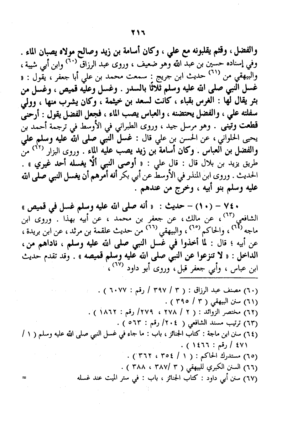 740 - (10) - حَدِيثٌ: «أَنَّهُ - صَلَّى اللَّهُ عَلَيْهِ وَسَلَّمَ - غُسِّلَ فِي قَمِيصٍ» الشَّافِعِيِّ، عَنْ مَالِكٍ، عَنْ جَعْفَرِ بْنِ مُحَمَّدٍ، عَنْ أَبِيهِ بِهَذَا. وَرَوَى ابْنُ مَاجَهْ، وَالْحَاكِمُ، وَالْبَيْهَقِيُّ مِنْ حَدِيثِ عَلْقَمَةَ بْنِ مَرْثَدٍ، عَنْ ابْنِ بُرَيْدَةَ، عَنْ أَبِيهِ؛ قَالَ: «لَمَّا أَخَذُوا فِي غُسْلِ النَّبِيِّ - صَلَّى اللَّهُ عَلَيْهِ وَسَلَّمَ -، نَادَاهُمْ مِنْ، الدَّاخِلِ: لَا تَنْزِعُوا عَنْ النَّبِيِّ - صَلَّى اللَّهُ عَلَيْهِ وَسَلَّمَ - قَمِيصَهُ» . وَقَدْ تَقَدَّمَ حَدِيثُ ابْنِ عَبَّاسٍ، وَأَبِي جَعْفَرٍ قَبْلُ.