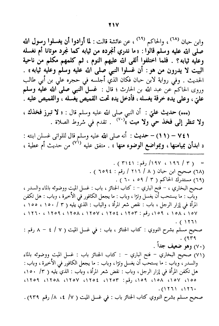 وَابْنُ حِبَّانَ، وَالْحَاكِمُ، عَنْ عَائِشَةَ قَالَتْ: «لَمَّا أَرَادُوا أَنْ يُغَسِّلُوا رَسُولَ اللَّهِ - صَلَّى اللَّهُ عَلَيْهِ وَسَلَّمَ - قَالُوا: مَا نَدْرِي أَنُجَرِّدُهُ مِنْ ثِيَابِهِ كَمَا نُجَرِّدُ مَوْتَانَا أَمْ نُغَسِّلُهُ وَعَلَيْهِ ثِيَابُهُ؟ . فَلَمَّا اخْتَلَفُوا أَلْقَى اللَّهُ عَلَيْهِمْ النَّوْمَ، ثُمَّ كَلَّمَهُمْ مُكَلِّمٌ مِنْ نَاحِيَةِ الْبَيْتِ لَا يَدْرُونَ مَنْ هُوَ: أَنْ غَسِّلُوا النَّبِيَّ - صَلَّى اللَّهُ عَلَيْهِ وَسَلَّمَ - وَعَلَيْهِ ثِيَابُهُ» . الْحَدِيثَ. وَفِي رِوَايَةٍ لِابْنِ حِبَّانَ فَكَانَ الَّذِي أَجْلَسَهُ فِي حِجْرِهِ عَلِيُّ بْنُ أَبِي طَالِبٍ، وَرَوَى الْحَاكِمُ عَنْ عَبْدِ اللَّهِ بْنِ الْحَارِثِ؛ قَالَ: «غَسَّلَ النَّبِيَّ - صَلَّى اللَّهُ عَلَيْهِ وَسَلَّمَ - عَلِيٌّ، وَعَلَى يَدِهِ خِرْقَةٌ يُغَسِّلُهُ، فَأَدْخَلَ يَدَهُ تَحْتَ الْقَمِيصِ يَغْسِلُهُ، وَالْقَمِيصُ عَلَيْهِ» .